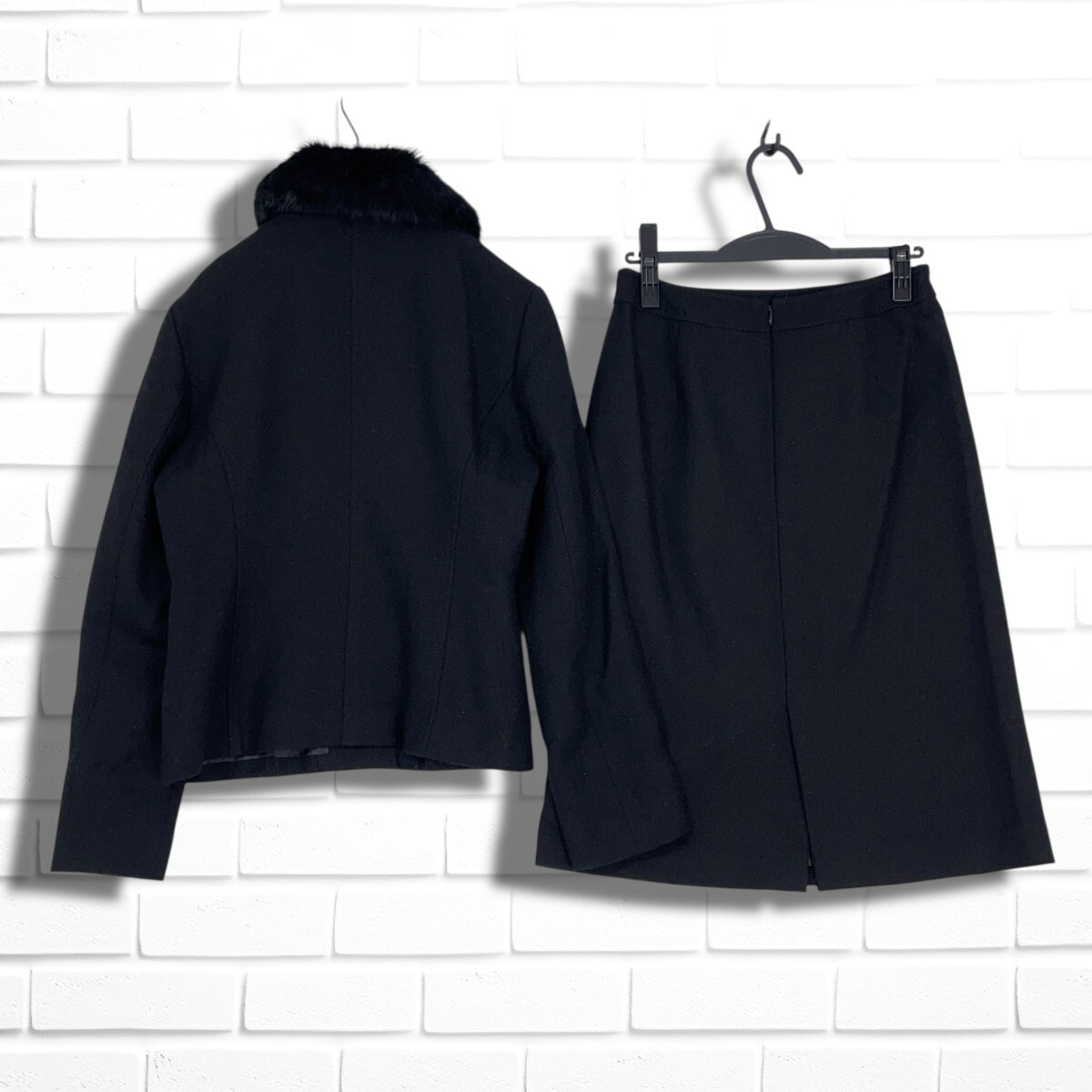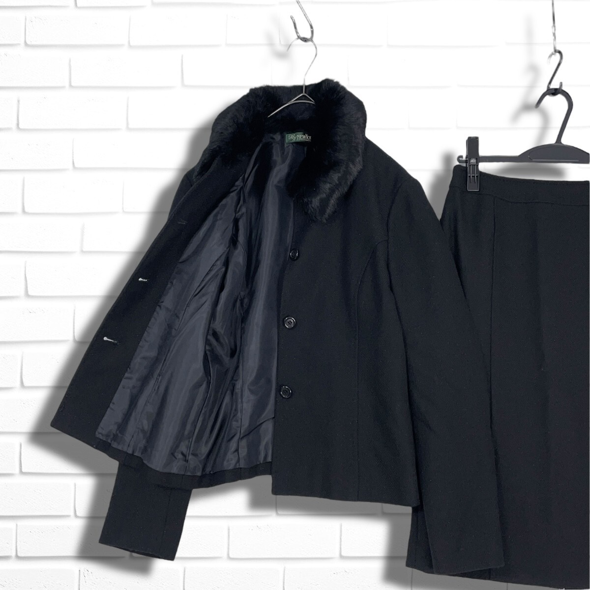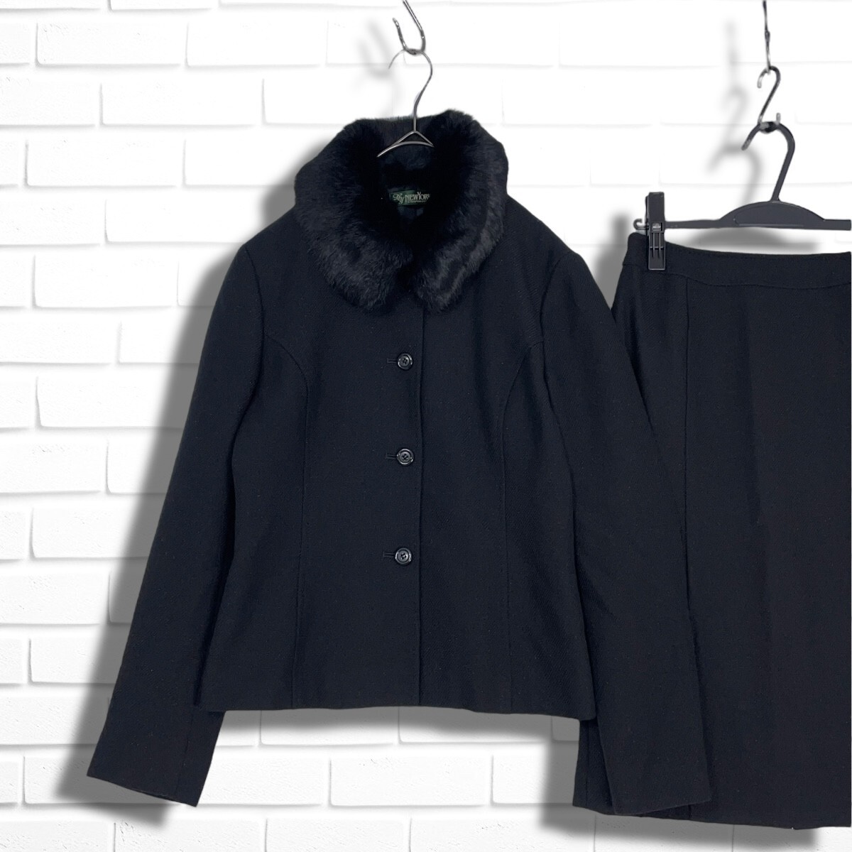 美品 NEWYORKER ニューヨーカー フォーマル セットアップ ラビット ファー ウール ジャケット スカート スーツ 黒 レディース 11 L 5635I◇