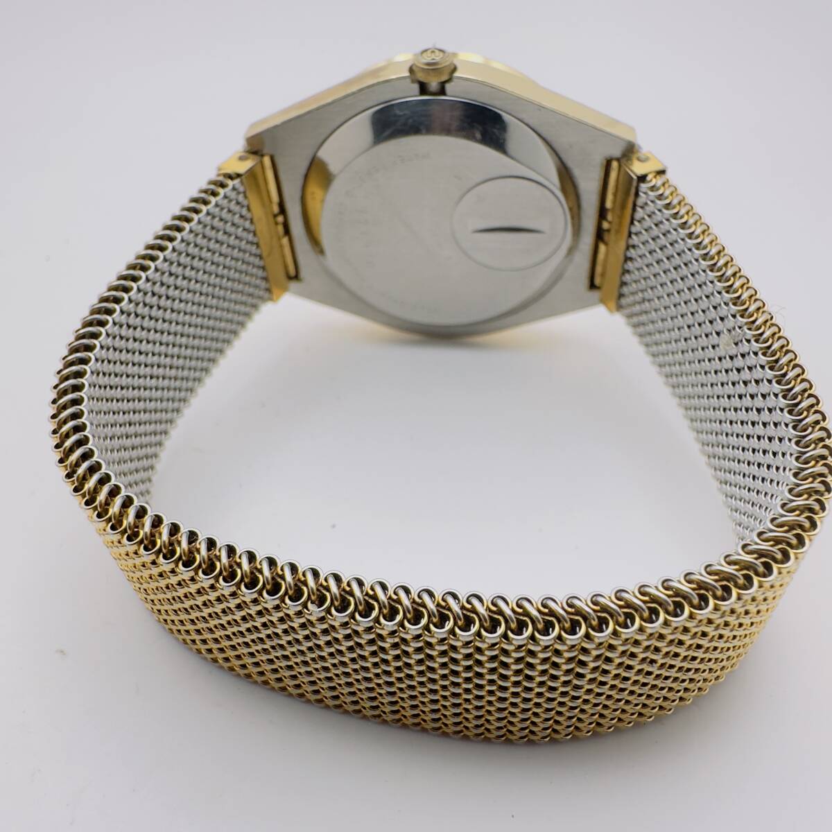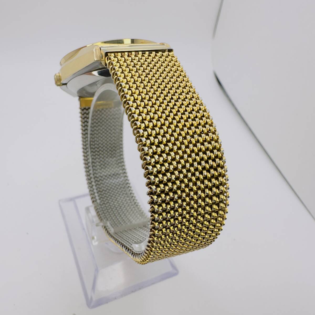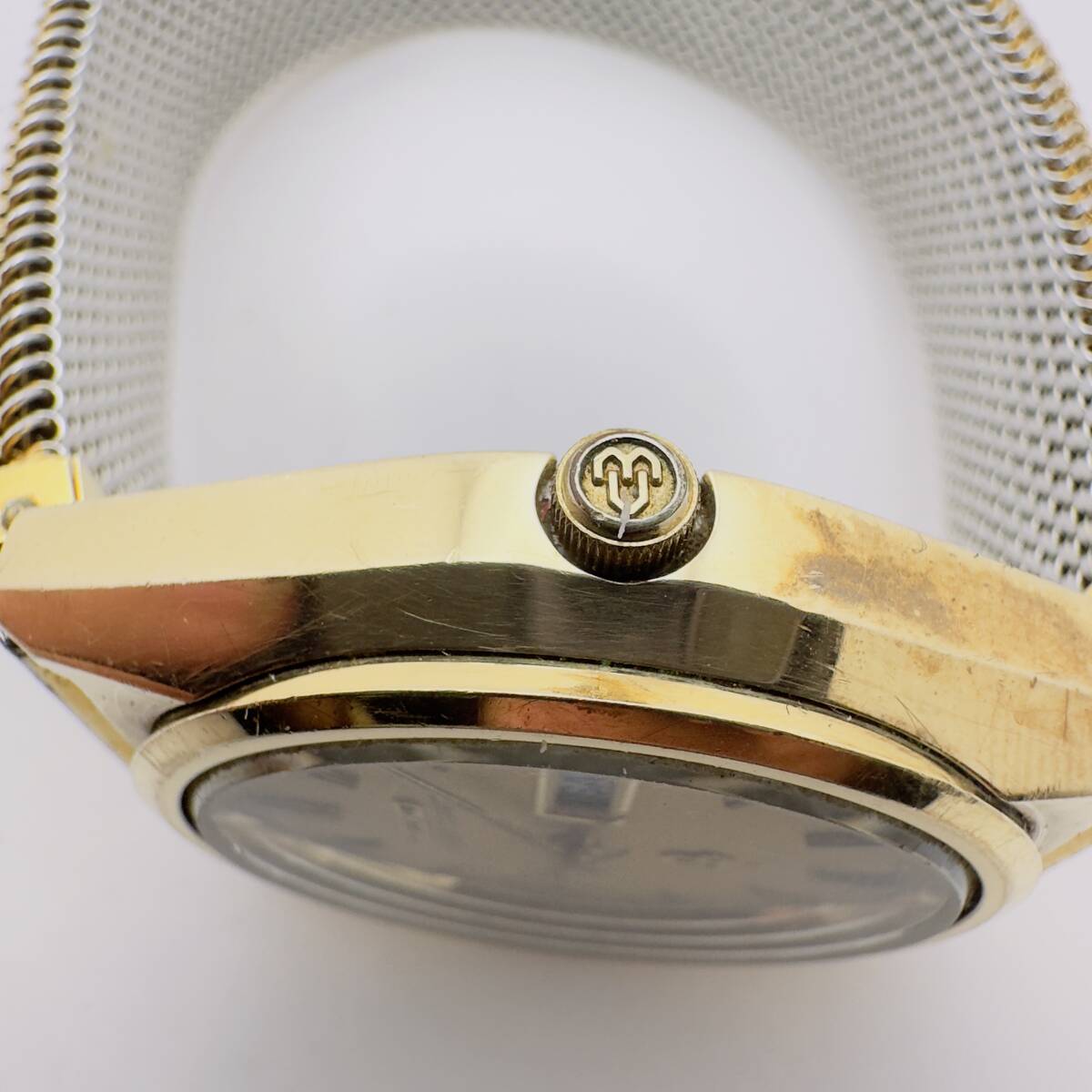 ゴールドトーンのラウンドケースにシャンパンカラーの文字盤を合わせたクラシックなデザイン。デイデイト表示付きで実用性も備えています。現在は不動ですが、全体的に保存状態は良好で、コレクションや修理ベースとして魅力的な一本です。