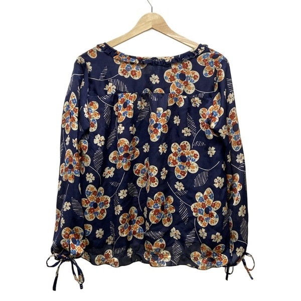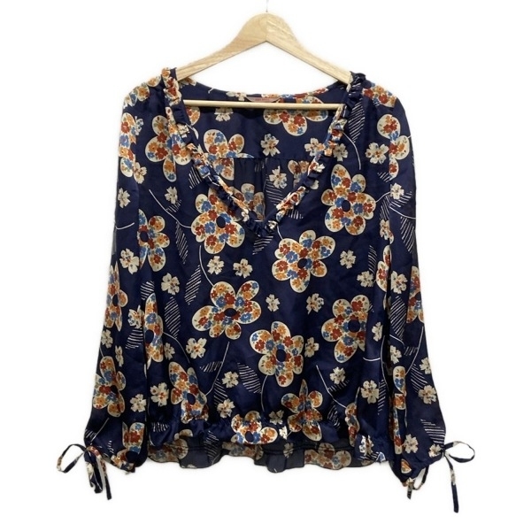 ピンクハウス PINK HOUSE 長袖カットソー - ネイビー×アイボリー×マルチ レディース Vネック/花柄/フリル 美品 トップス
