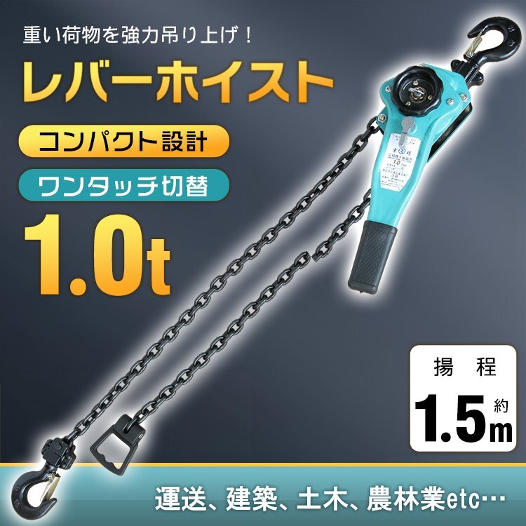 1円 レバーホイスト 1t 1トン 1ton 揚程 1.5m チェーンブロック 軽量 ワンタッチ 1000kg チェーンホイスト チェーンローラー sg318