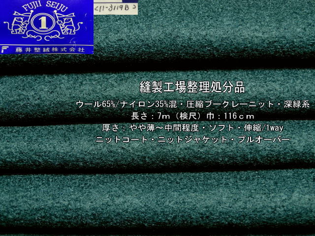 商品説明 | 縫製工場様からの整理・処分品の激安処分です。 商品知識は御座いませんが、大量の余財を処分させて頂きます。 商品は、ウール65%/ナイロン35%混・圧縮ブークレーニット 色調は、深緑系でございます。 長さは、7m(検尺)巾は、116cmです。 厚さは、やや薄~中間程度・ソフト・伸縮/1wayでございます。 ニットコート・ニットジャケット・プルオーバーなどに いかがでしょうか。 この機会にお試し下さい。 |