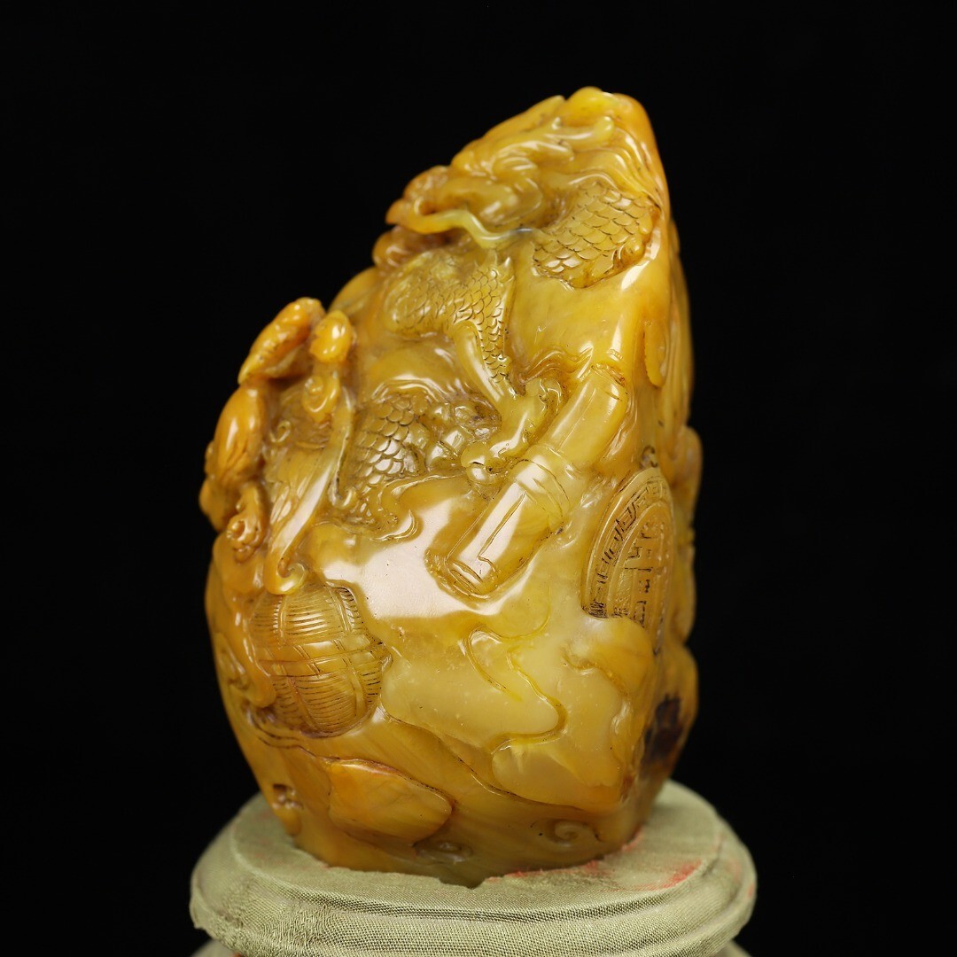 「清 丁敬 老寿山石 田黄石彫り 龍鳳呈祥 印章」極細工 擺件 古賞物 中国古美術 旧蔵出