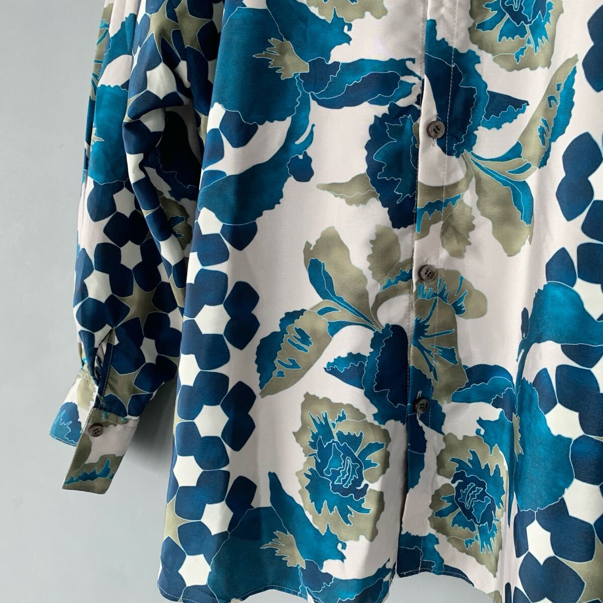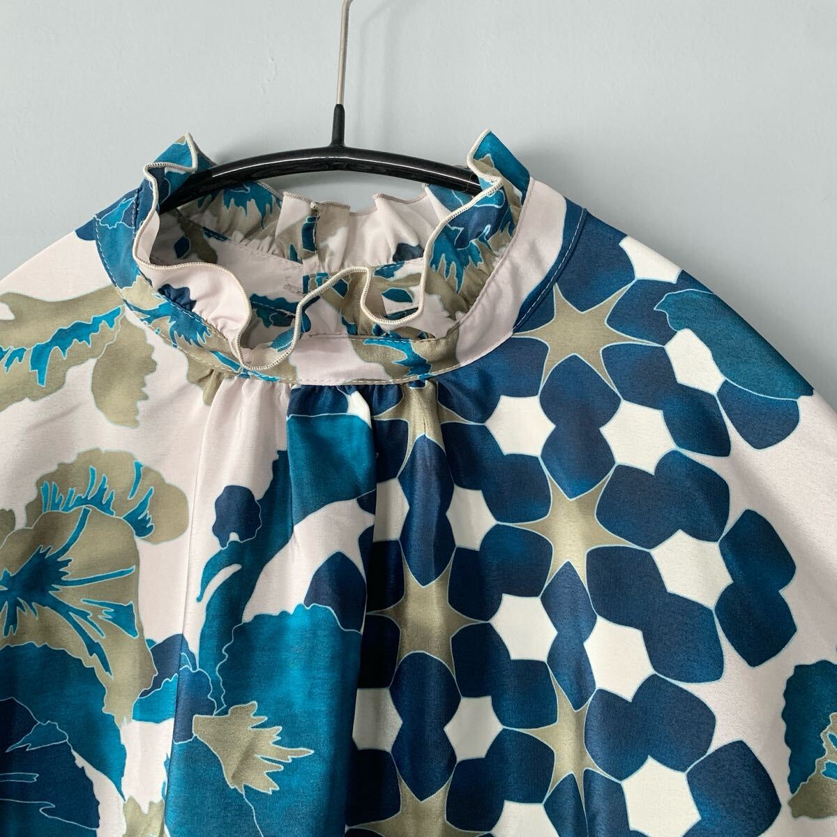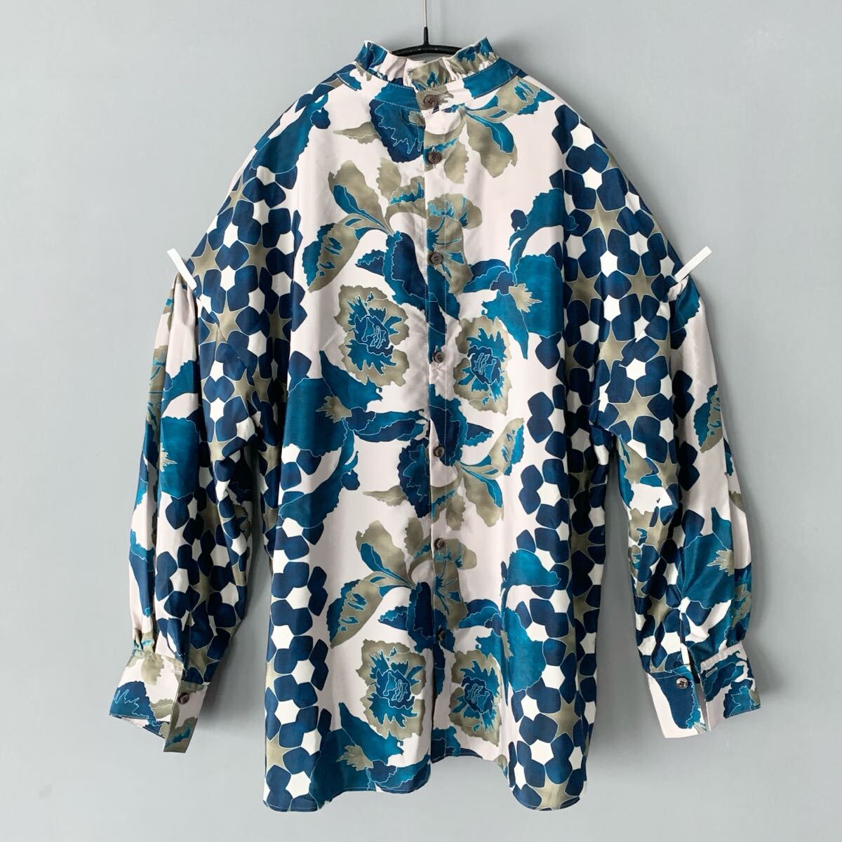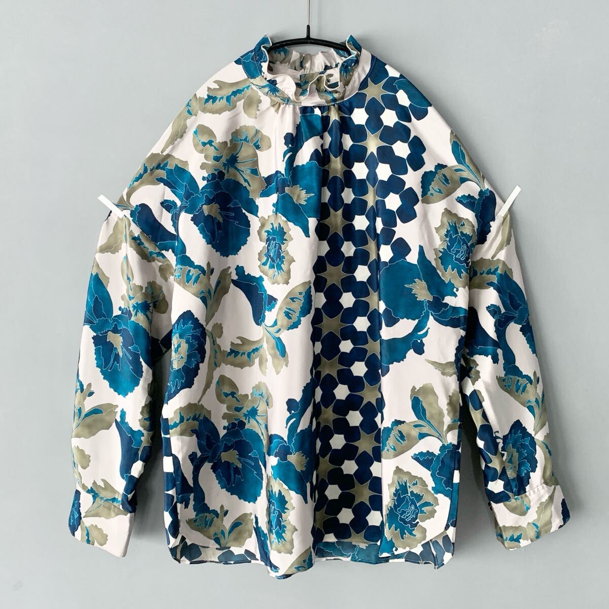 ステラシフォンの2024S/Sのブラウスです。さらっとした生地に雰囲気のあるプリントが配されたデザインで、後ろセンターがボタン留めになっています。身幅もゆったり、肩が落ちる今風のデザインで、袖の付け根にもタックが入ってボリューム感を出しています。