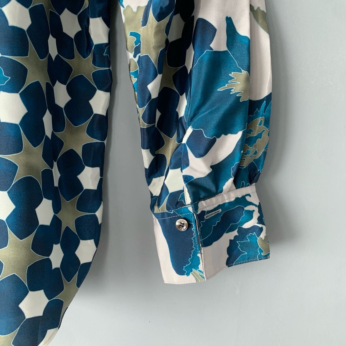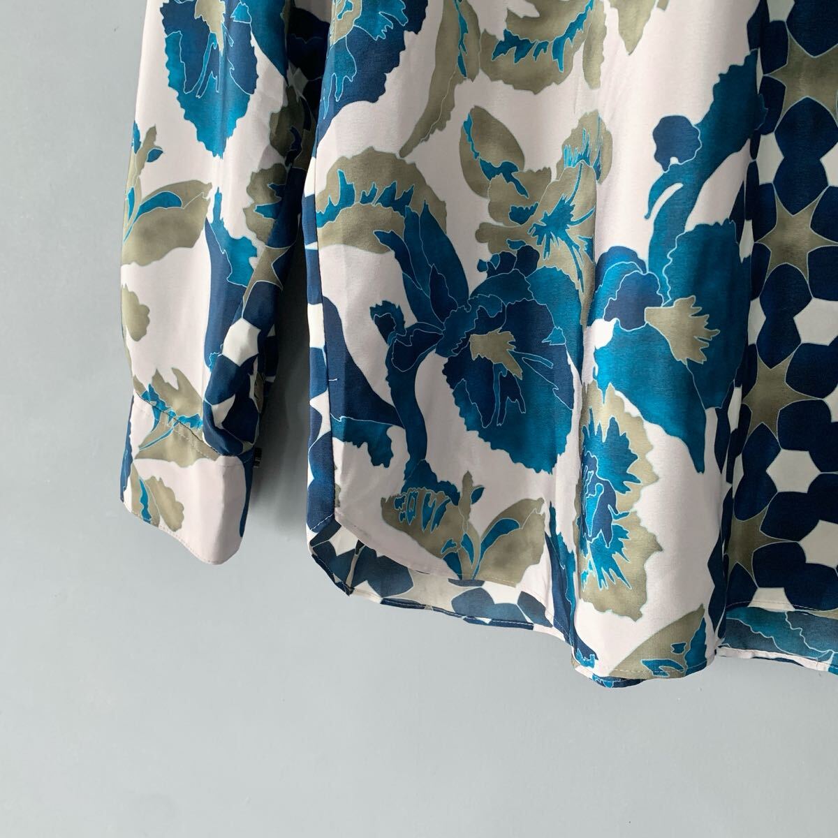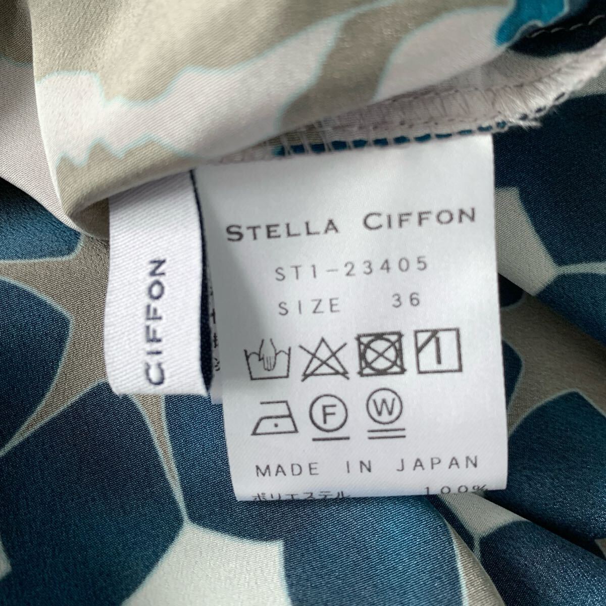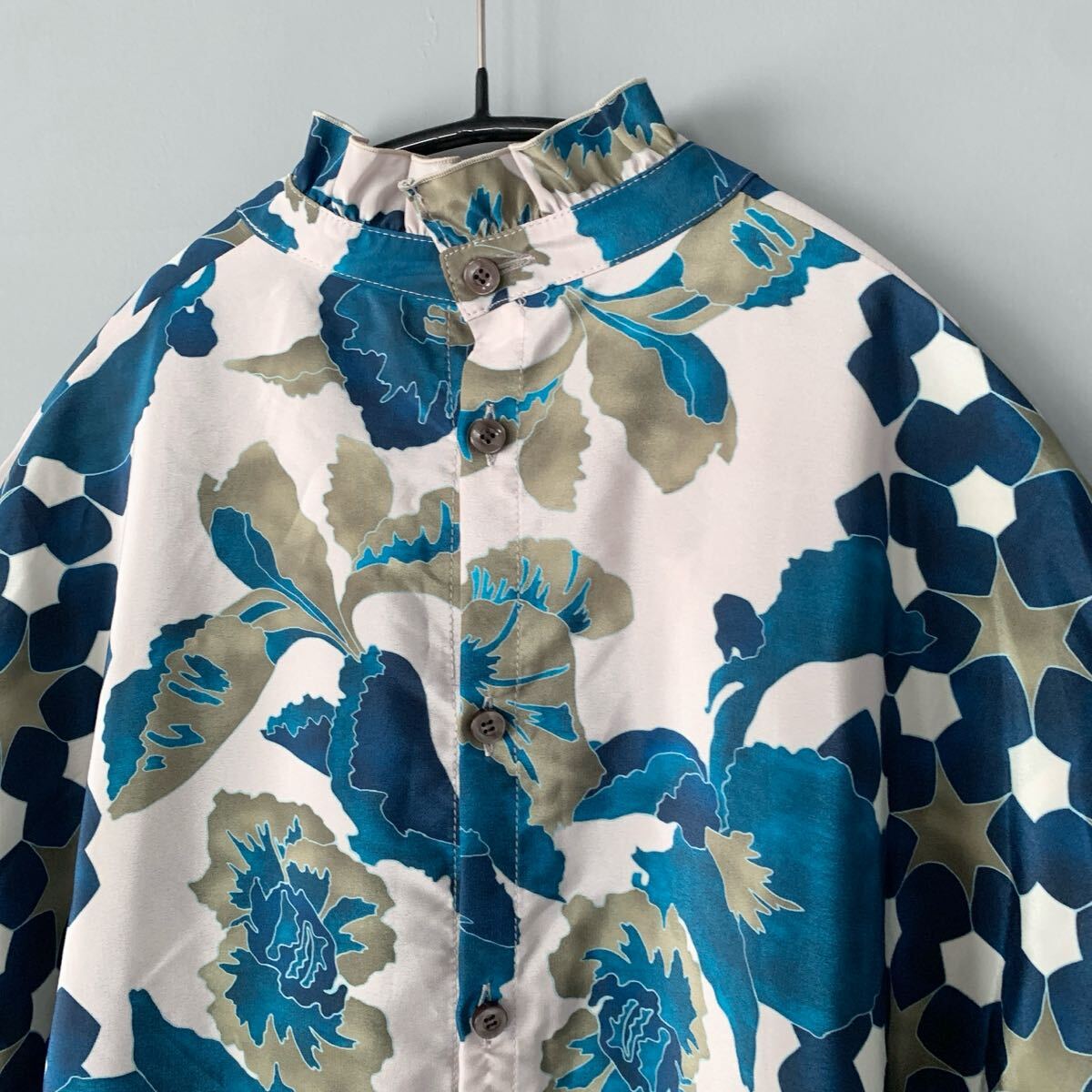 ステラシフォンの2024S/Sのブラウスです。さらっとした生地に雰囲気のあるプリントが配されたデザインで、後ろセンターがボタン留めになっています。身幅もゆったり、肩が落ちる今風のデザインで、袖の付け根にもタックが入ってボリューム感を出しています。