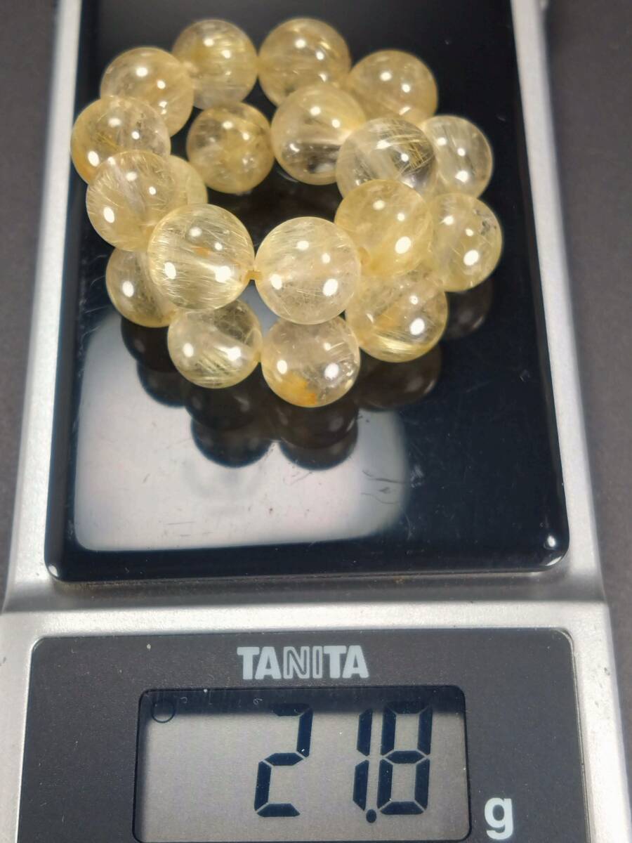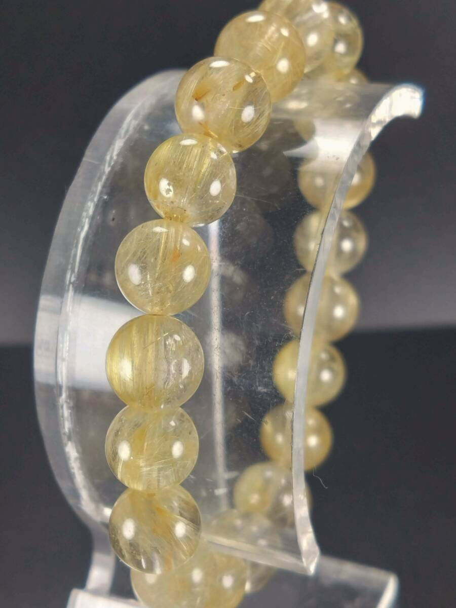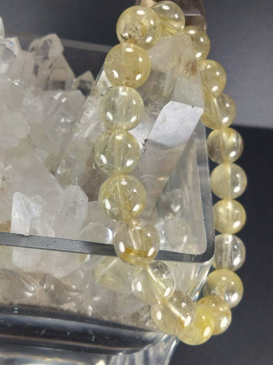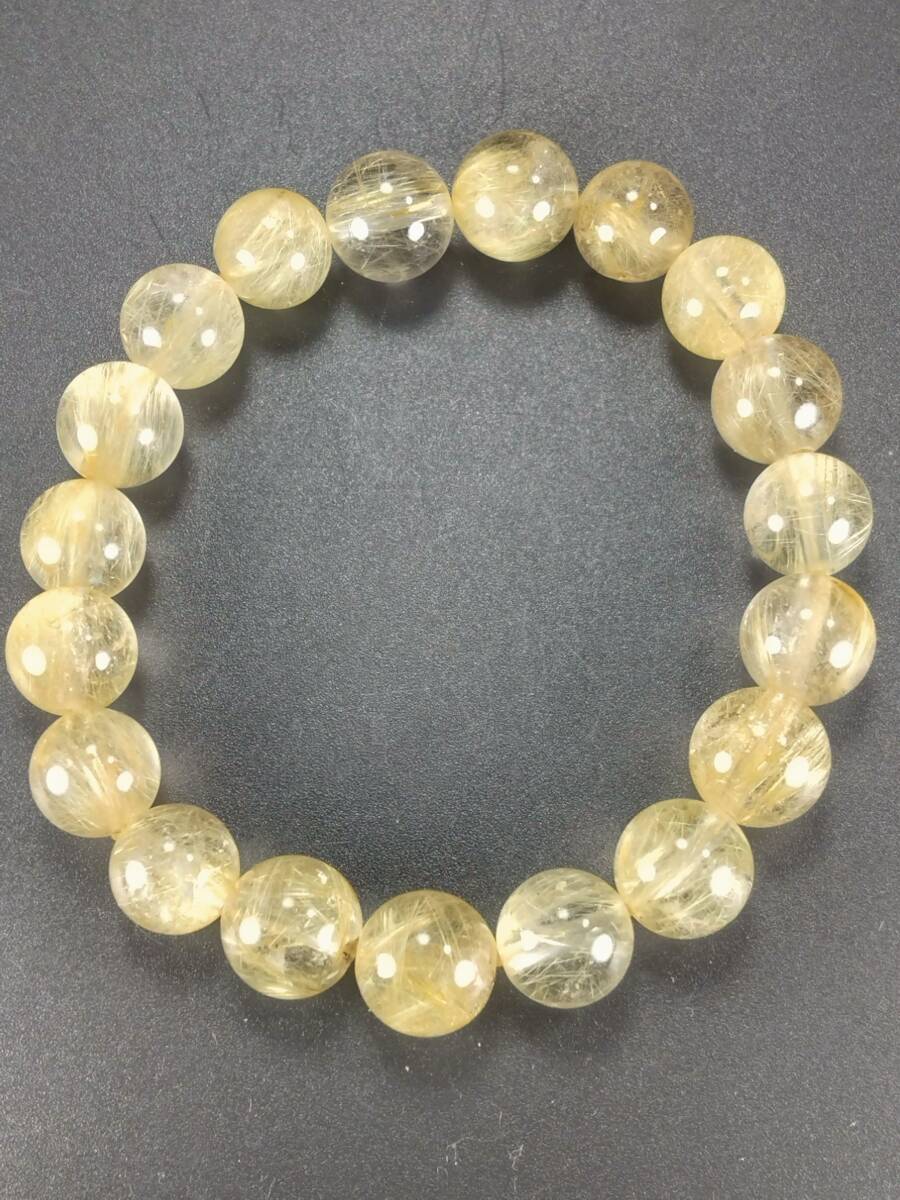 今回のブレスレットは透明感が有り全体的には細目のルチルが一方向に流れているタイプが多く使われ高級ルチルインクォーツに近いと思います 中には根っこ(ヘマタイト)からの放射ルチルが含まれ所々にタイチンルチルが主張するバランスのとれた結構綺麗なブレスレットです