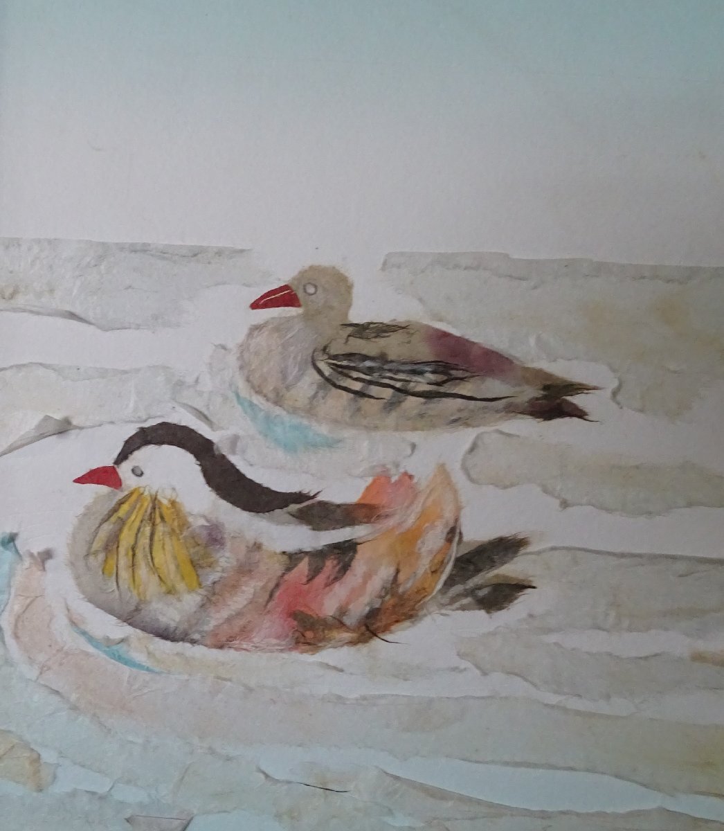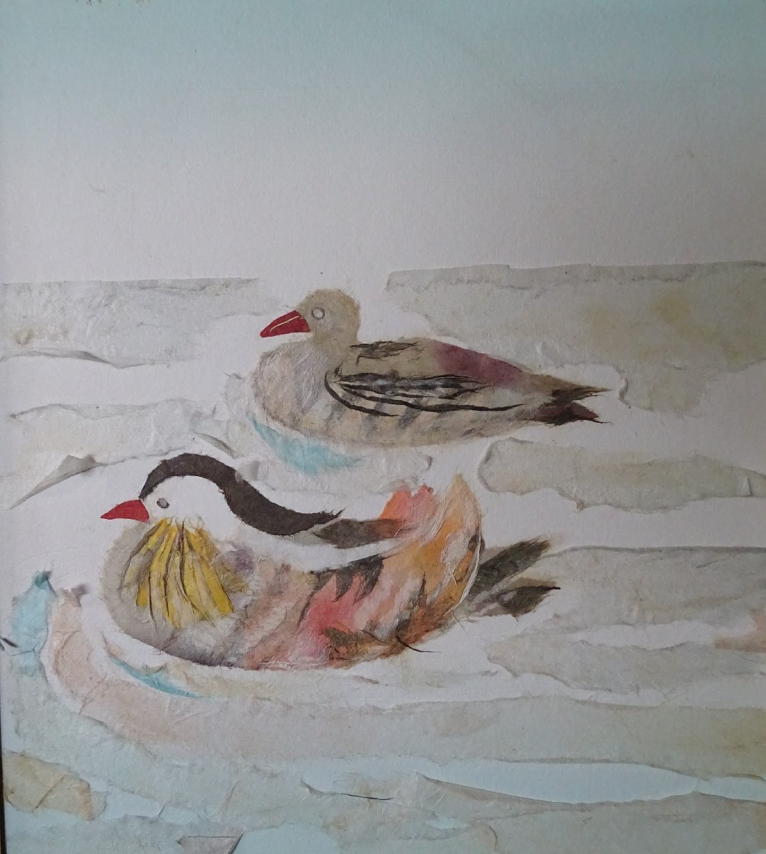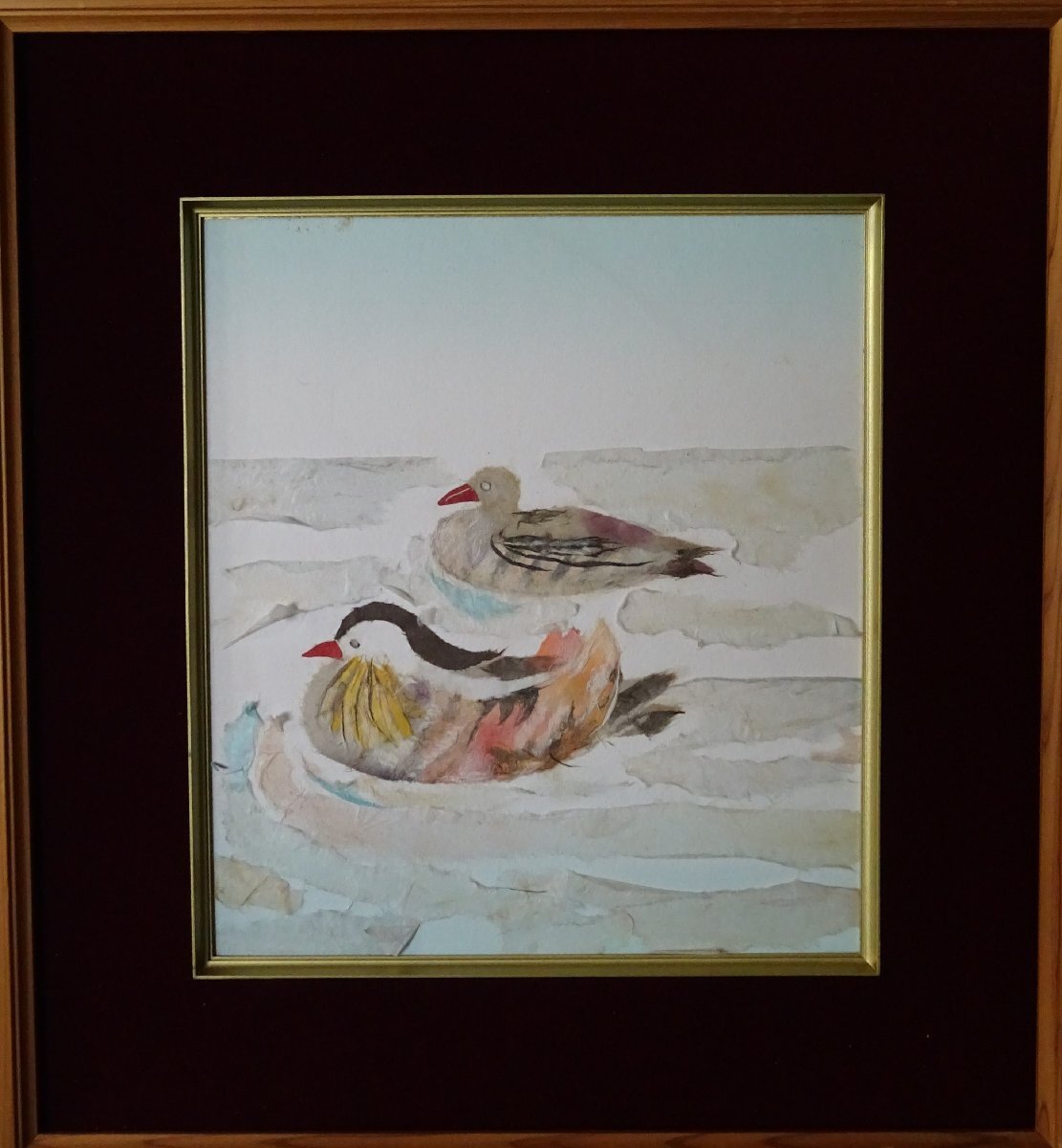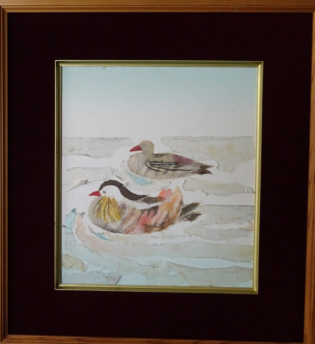 ・作者: 並川徳子 ・画題: おしどり ・技法: 色紙和紙ちぎり絵 ・NO-R6-5-6.8