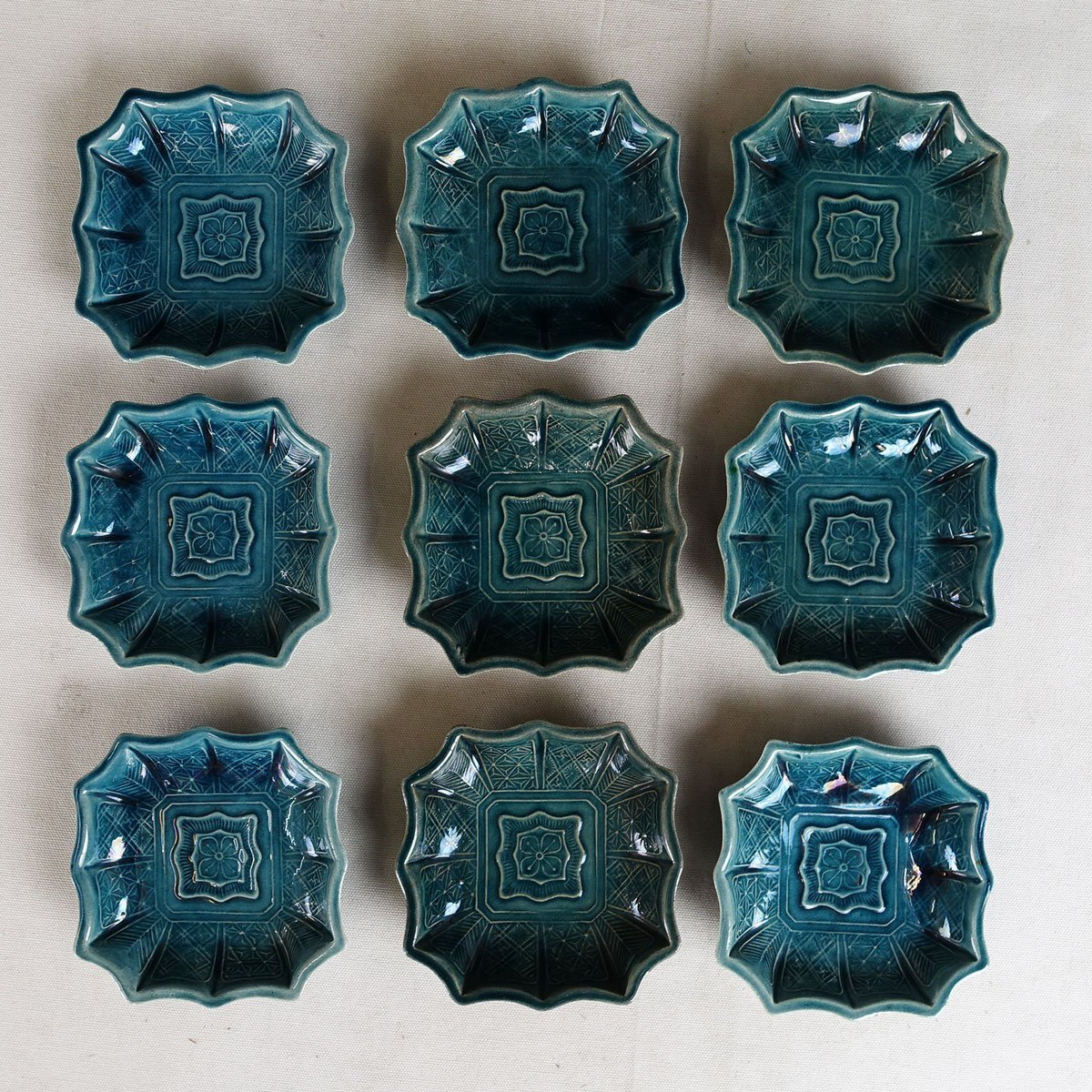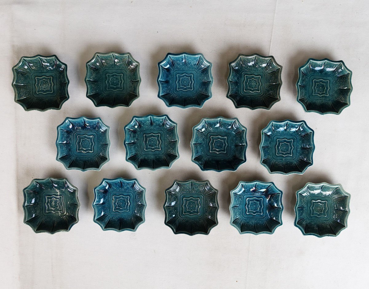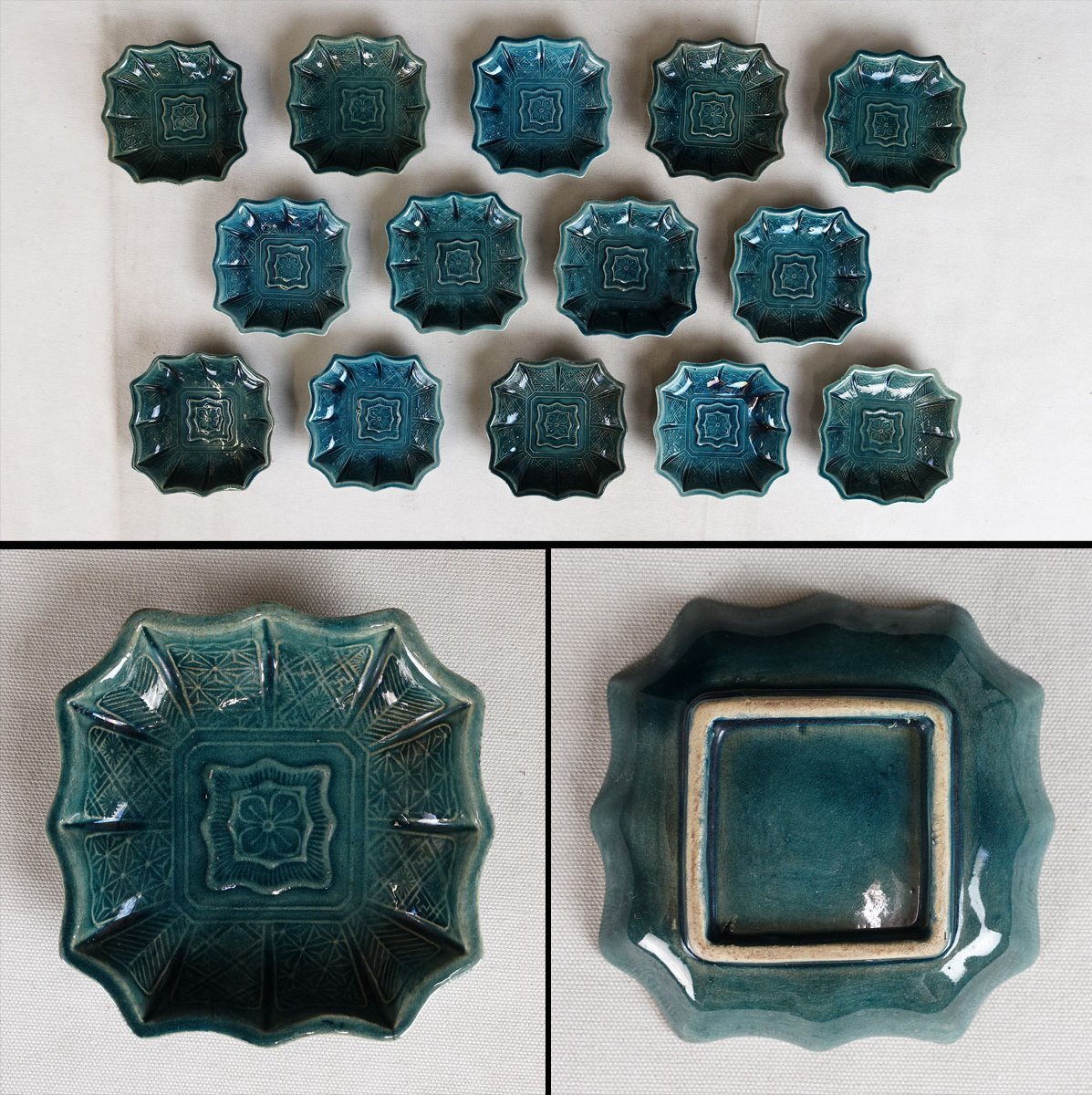 整理品 蔵壷◆『珉平焼 瑠璃釉 花文様』 14枚 陶磁器 淡路焼 伝統工芸 賀集珉平 四方皿 角皿 小皿 豆皿 茶道具 兵庫県南淡路 江戸後期明治