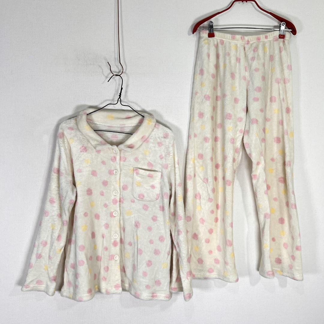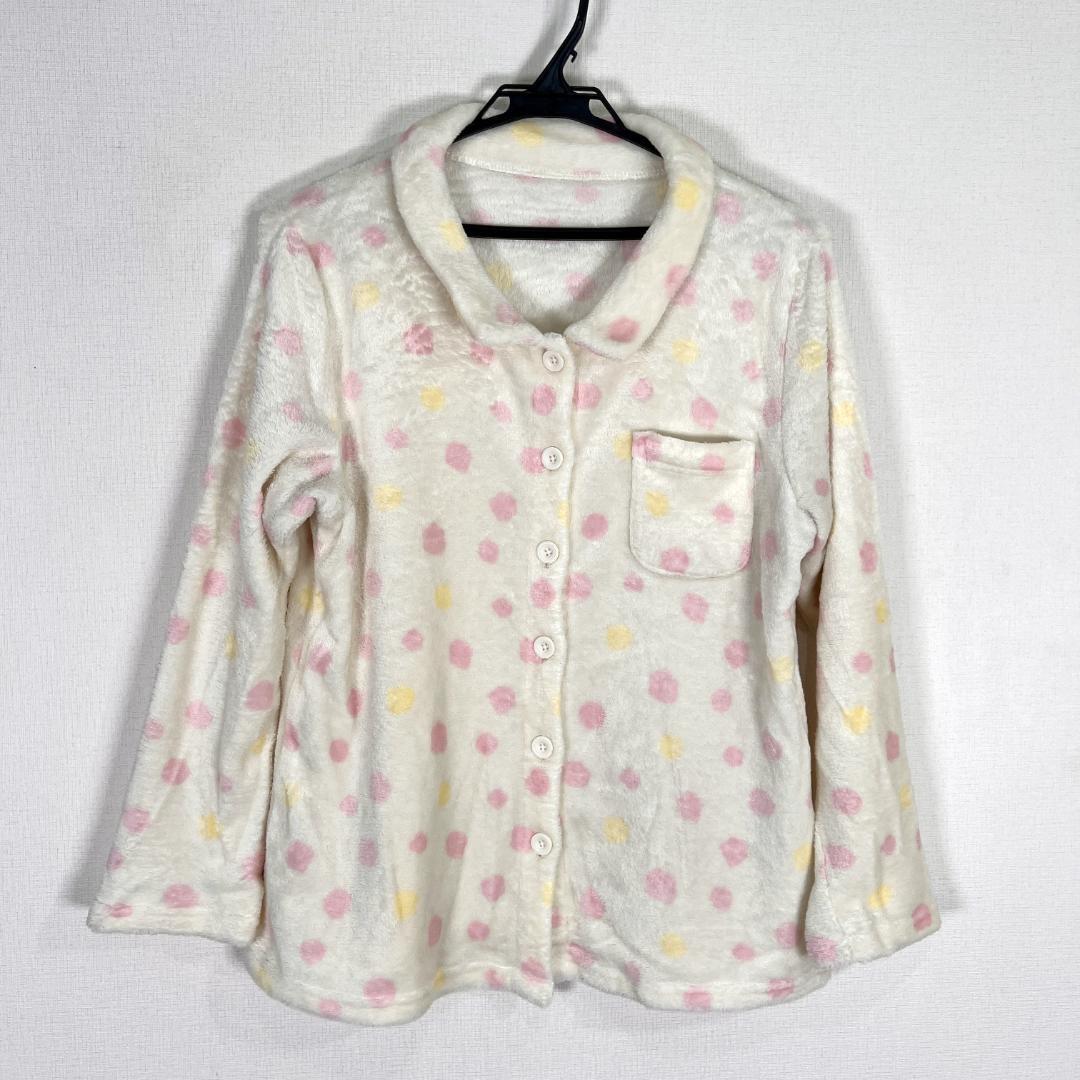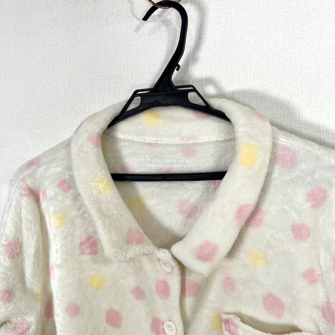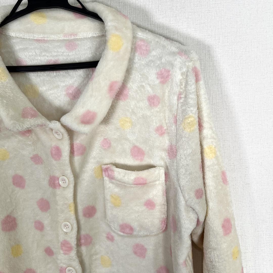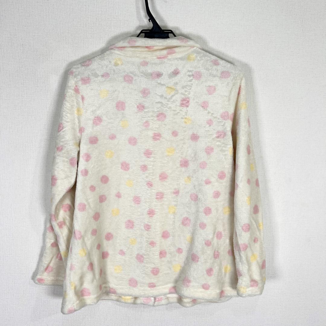 女性用ホワイト系のピンクとイエローのドット柄の長袖パジャマ ルームウェア 部屋着 です。中古品ですが目立つ傷や汚れもなく、まだまだ使えます。古着 株式会社チュチュアンナ