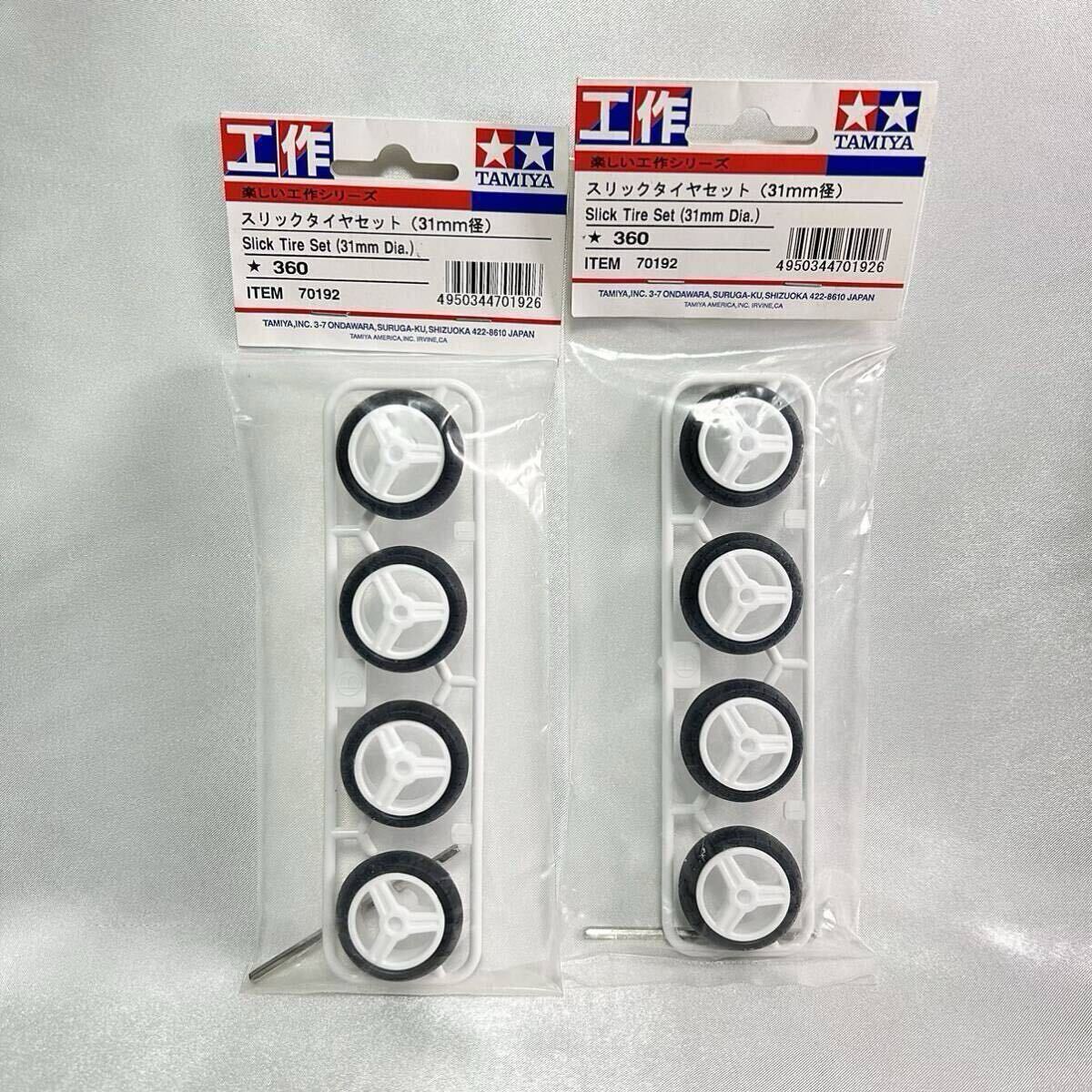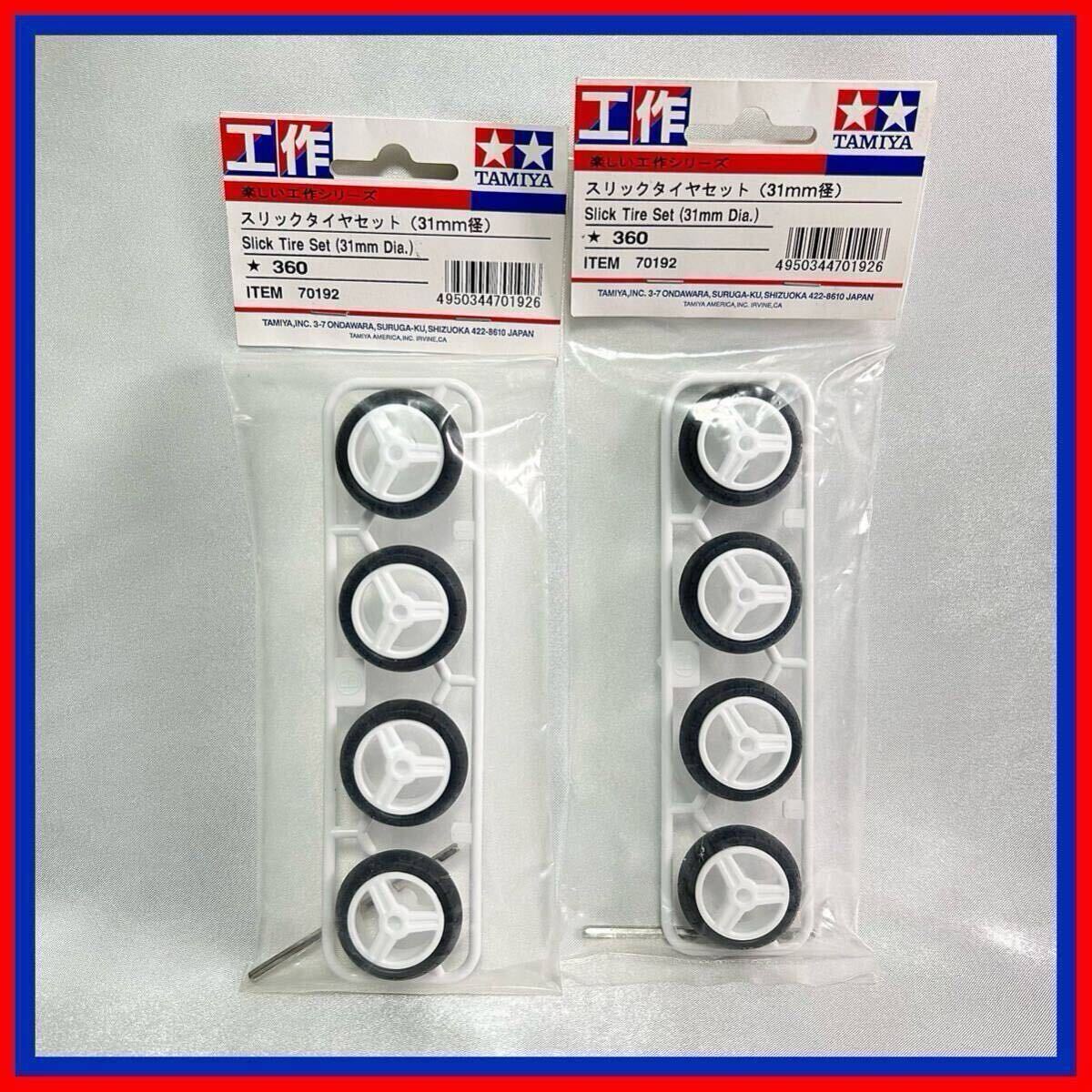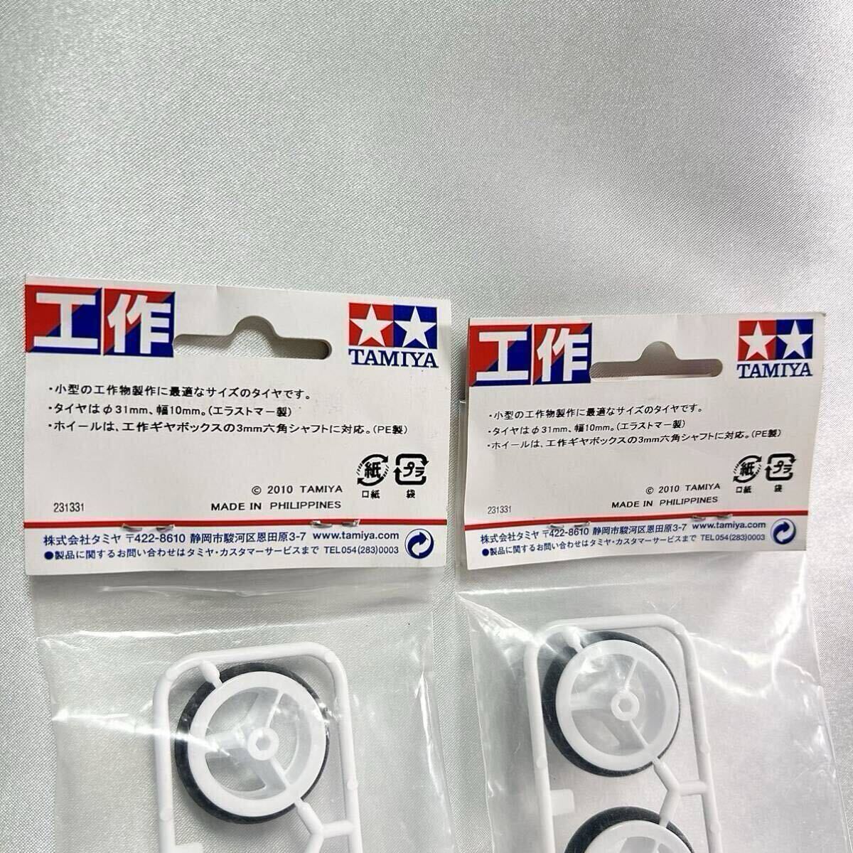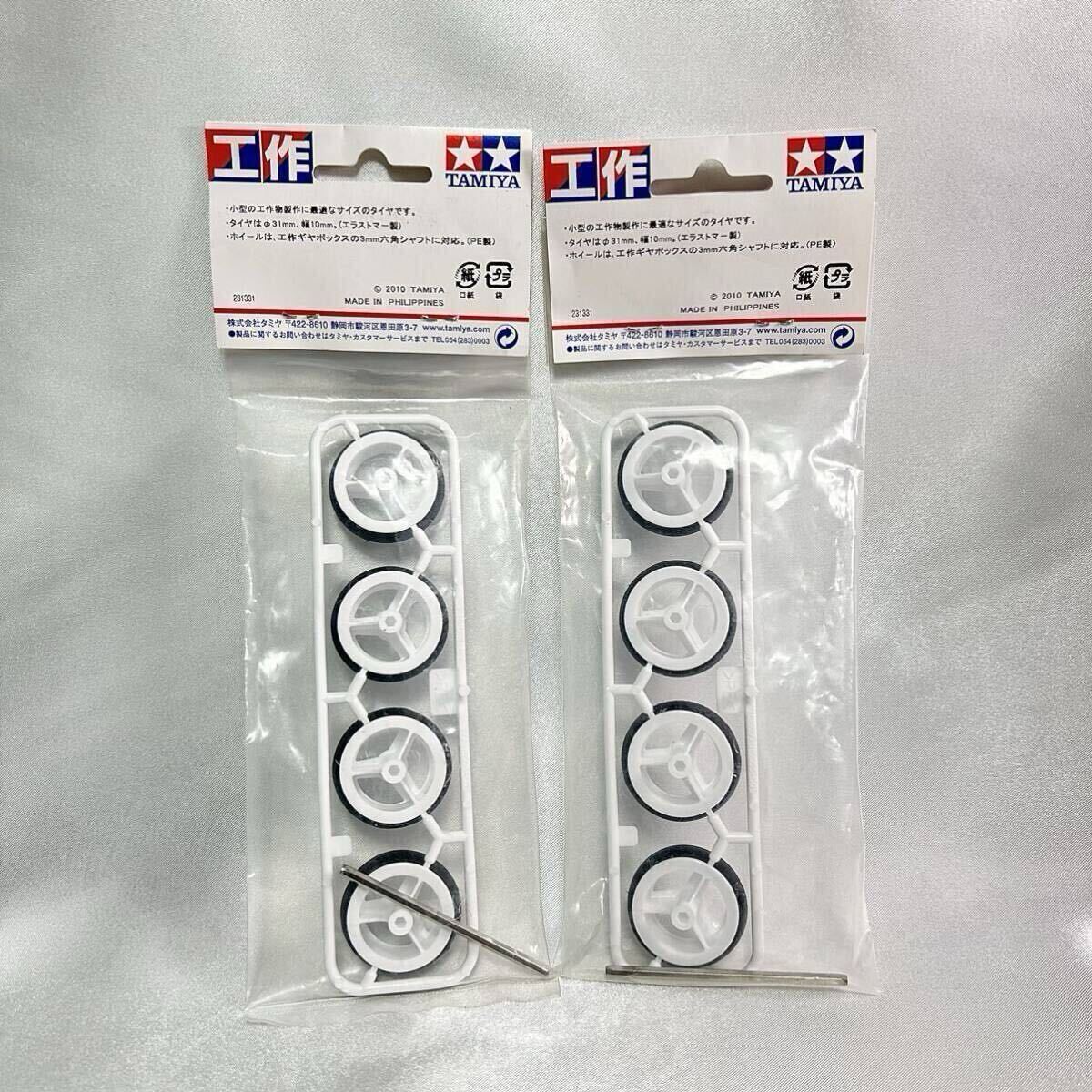 工作パーツとしては最小サイズの直径31mm、幅10mmのタイヤセットです。 ホイールは楽しい工作ギヤボックスの3mm六角シャフトに対応。