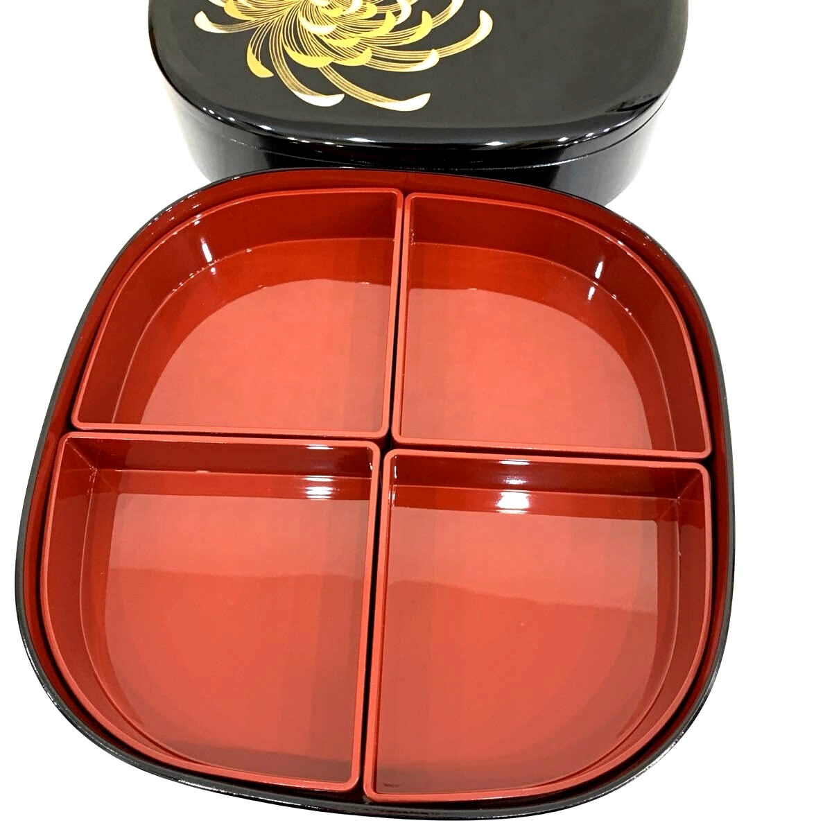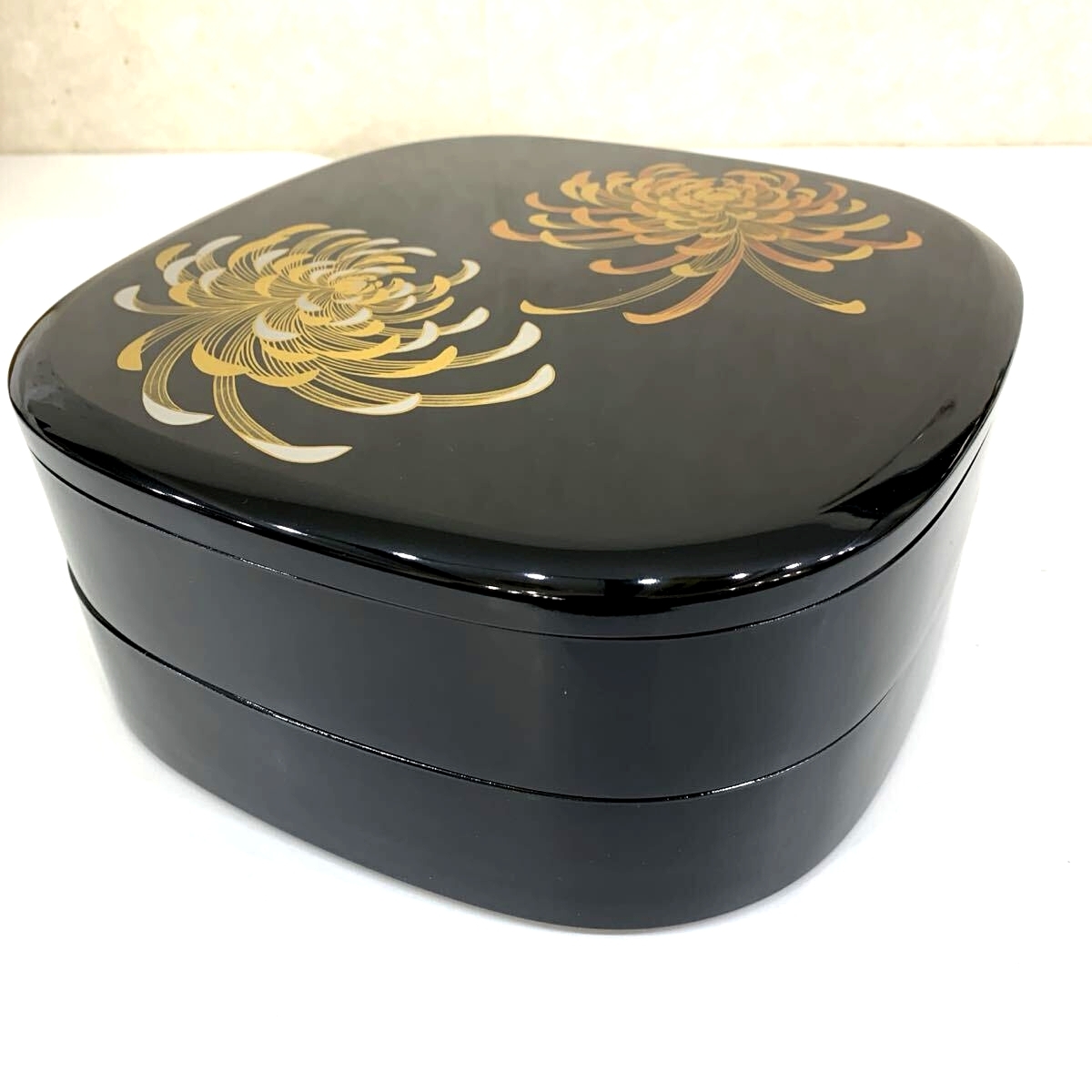 くつわ 二段 オードブル 乱菊 黒 二段重 重箱 漆器 箱付き R7S58r