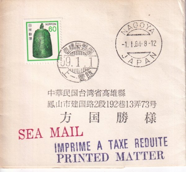 梵鐘60円(帳)貼帯封 台湾宛船便印刷物(低料) 鉄郵印 豊橋辰野間 59.1.1 上一豊飯 NAGOYA 1.1.84 エンタイア