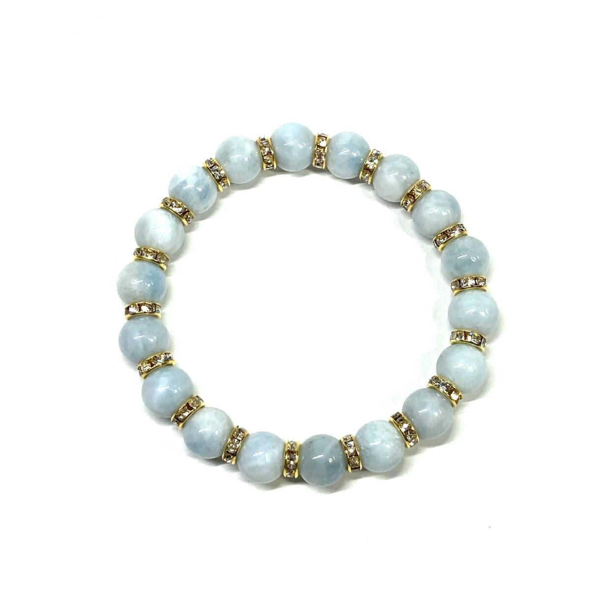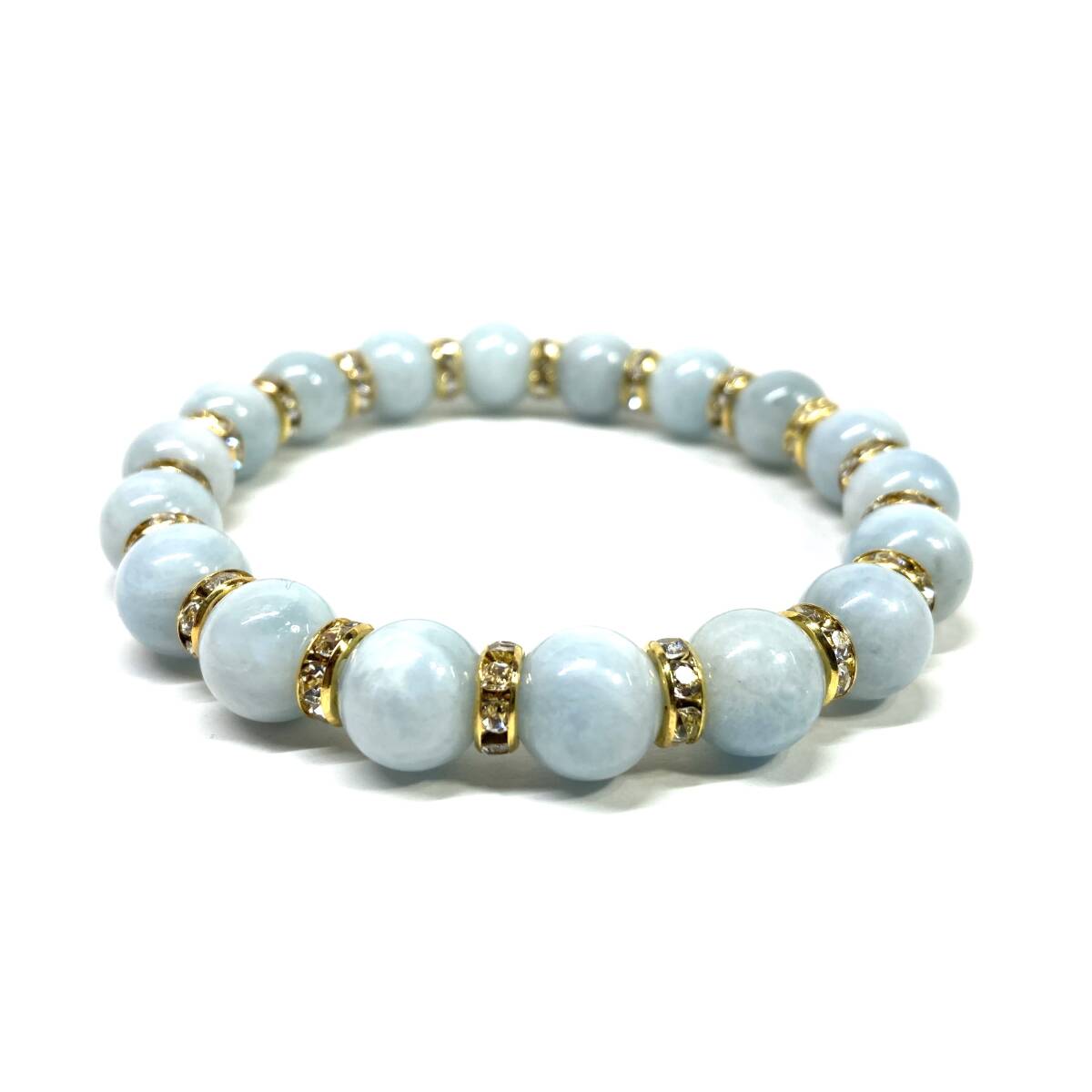 こちらは、10mm玉のアクアマリンを使用したパワーストーンブレスレットです。シンプルなデザインは、男女問わずどんなコーディネートとも合わせ易いブレスレットです。サイズは内周約18cmです。数に限りがございますので気になる方はお早めにどうぞ。