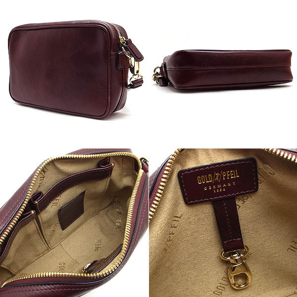 コメント 160年の歴史を持つゴールドファイル(GOLD PFEIL)。伝統的なデザインと職人技から生まれたオックスフォードシリーズのセカンドバッグです。長く使うことによって、美しい艶と味わいが出てくることも特徴です。ベーシックなデザインで、ボルドーのカーフレザーに、ゴールドカラーの金具が映えます。ストラップは取り外し可能。
