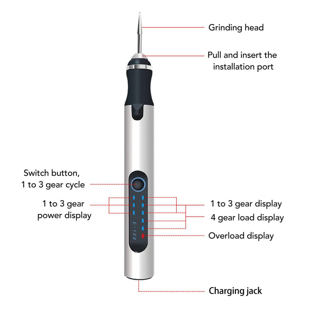 • 彫刻ペンは、市場に出回っている他の多くのモーターよりも優れた制御と取り扱いを提供する改良された高性能 18000RPM モーターを備えています。