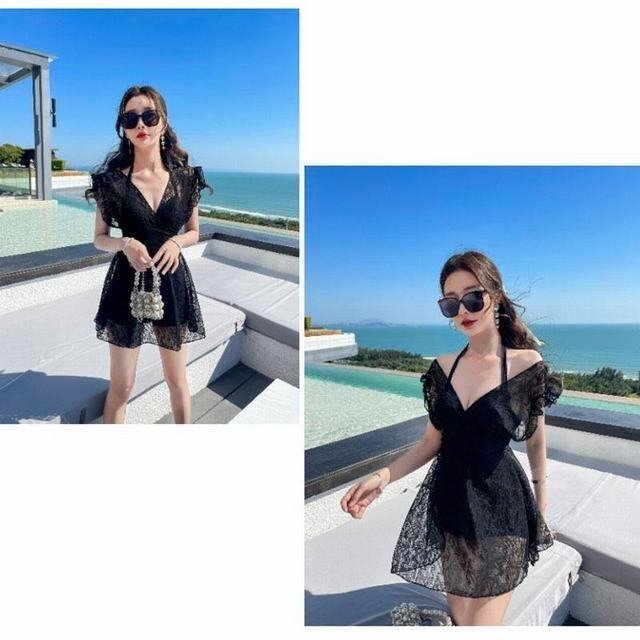 小胸バンドゥ オシャレ韓国風 水着 レディース 体型カバー ワンピースレース 着痩せ ブラック L