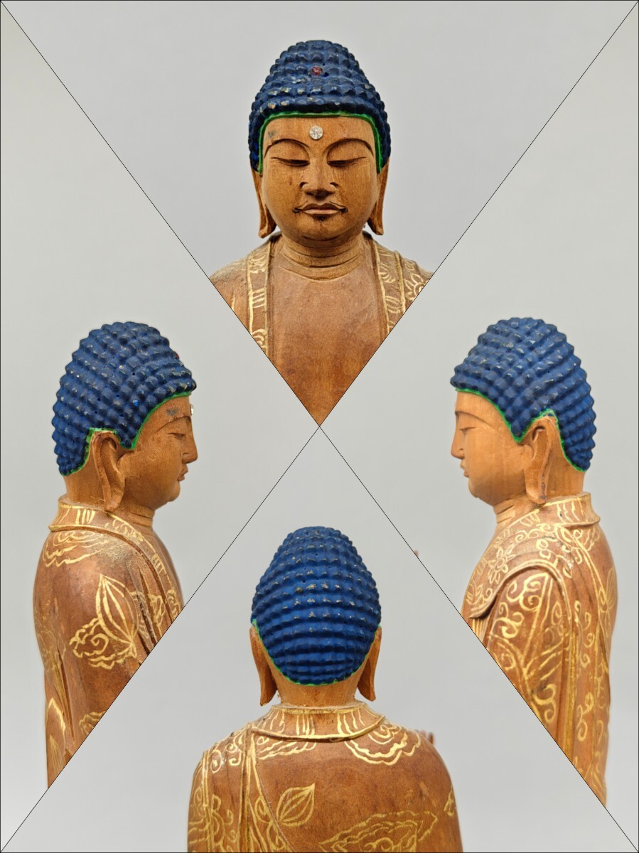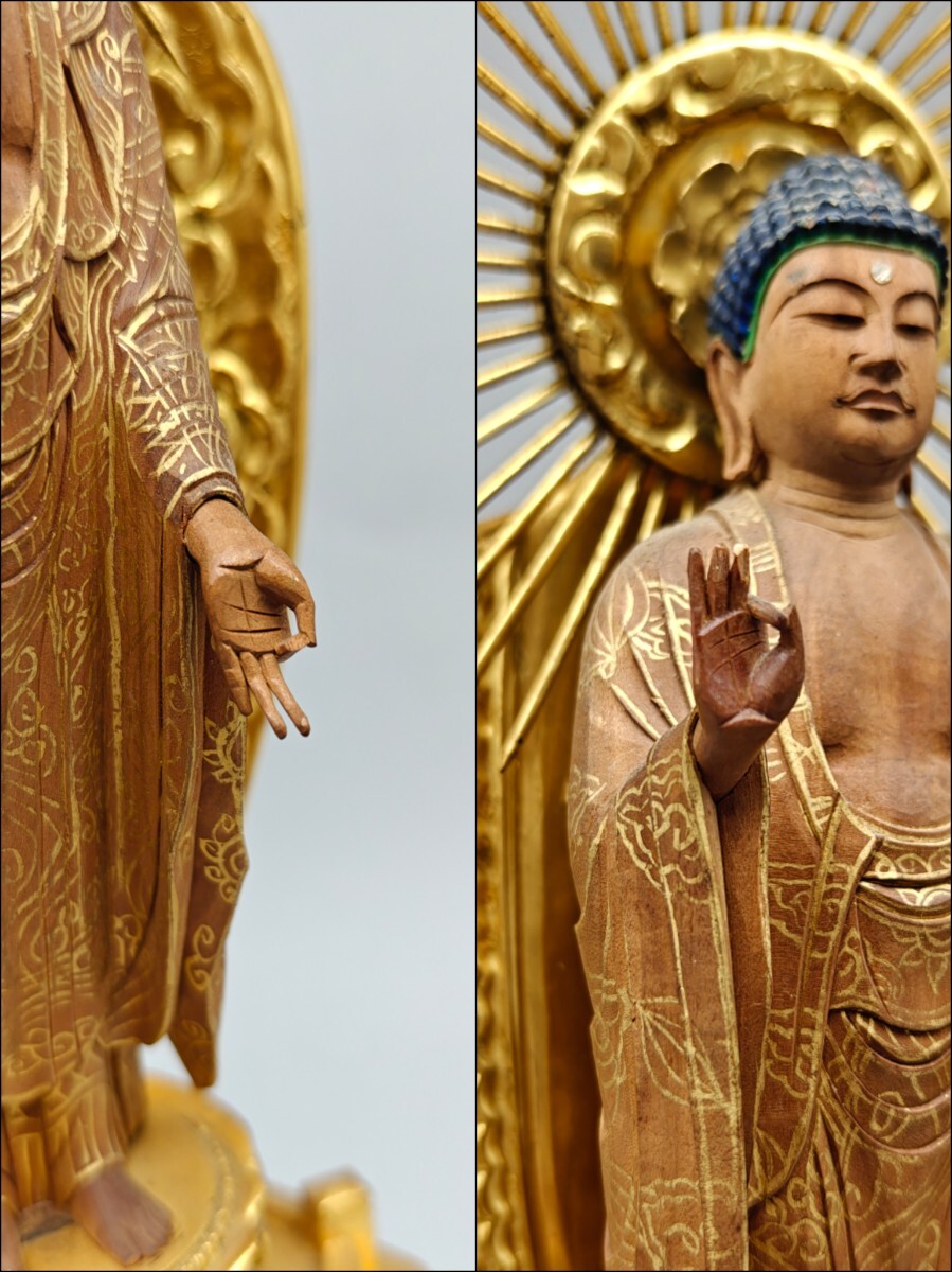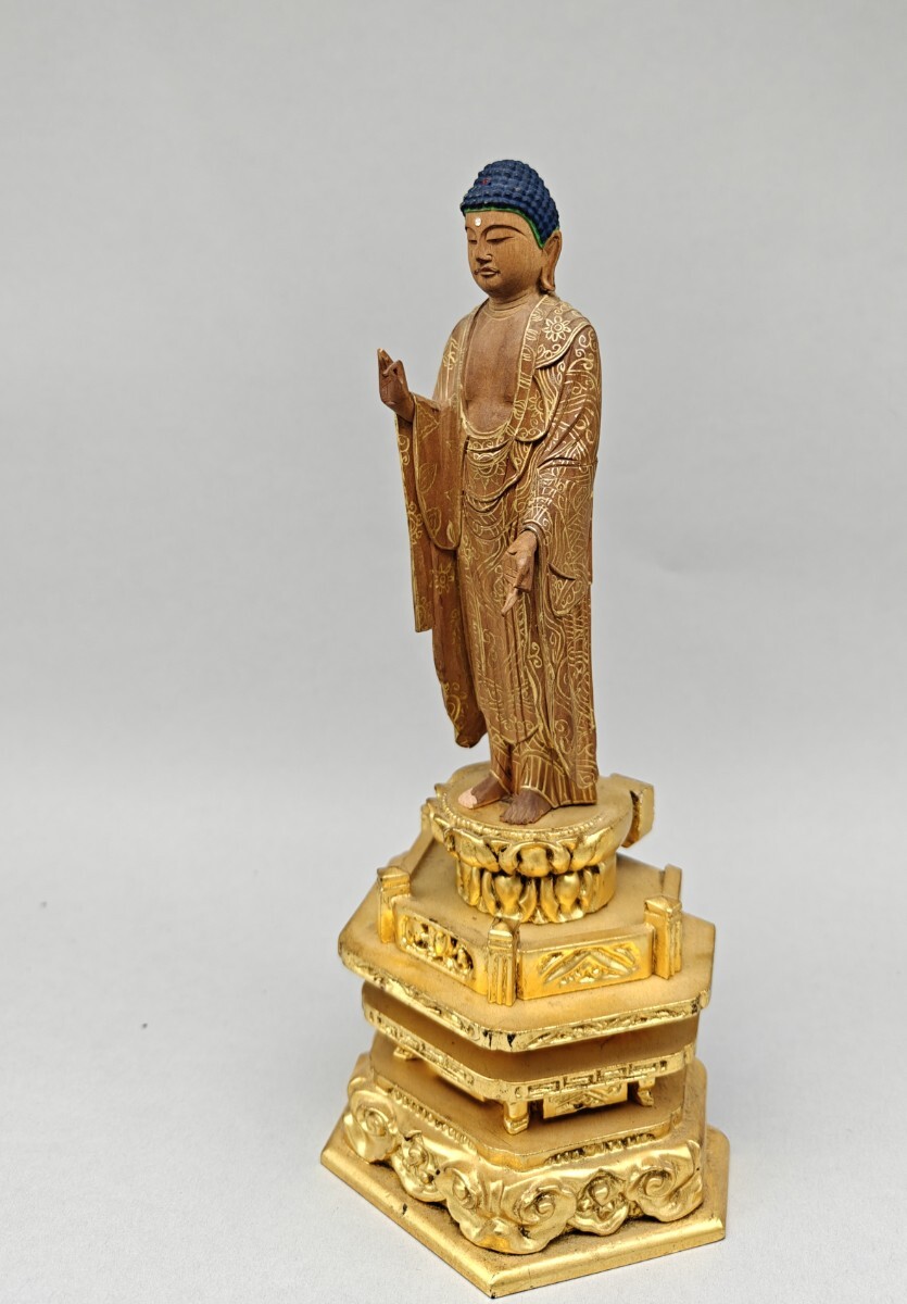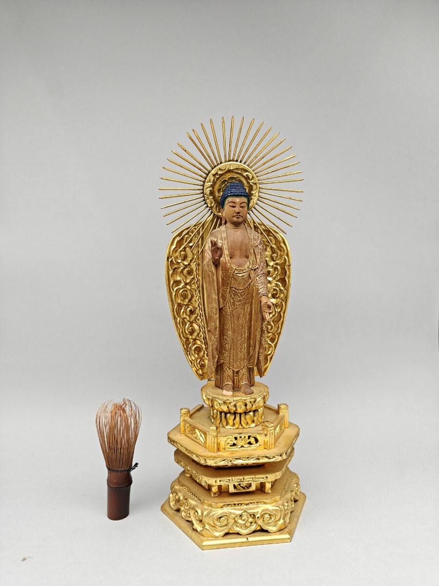 【懐】仏像 木彫 阿弥陀如来像 仏教美術 細密彫刻 金彩色絵 置物 木製 AF-029