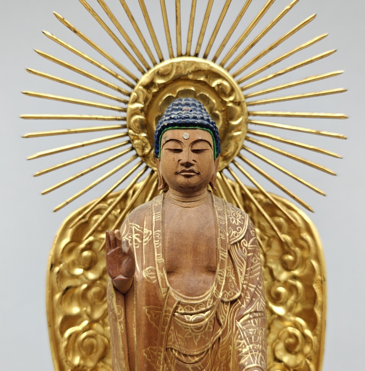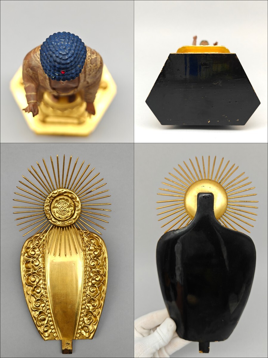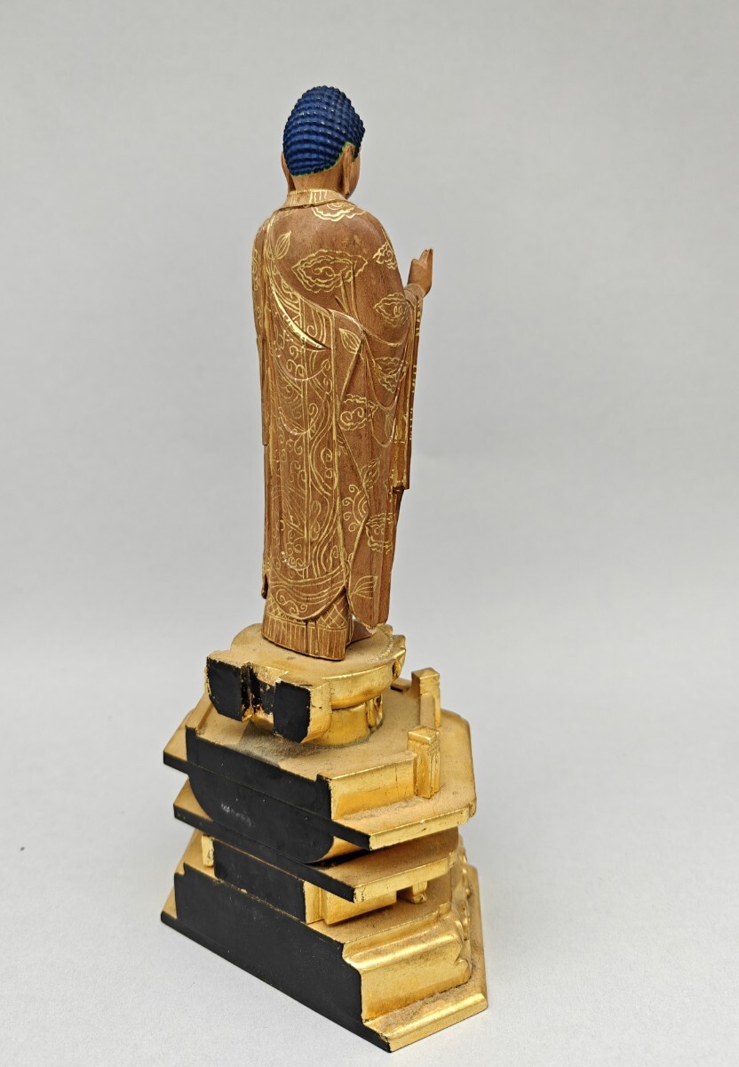 【懐】仏像 木彫 阿弥陀如来像 仏教美術 細密彫刻 金彩色絵 置物 木製 AF-029