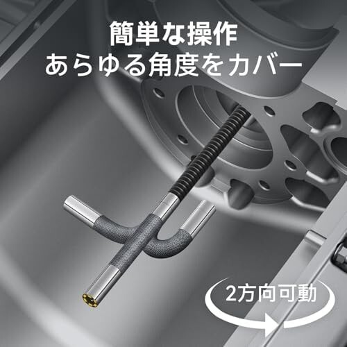 狭い場所でもスムーズに操作可能: 直径5.5mmの超薄型プローブにより、標準的な8mmプローブと比較して狭い箇所へのアクセスが容易に。柔軟性のある約1.55m(5ft)のグースネックで操作性も抜群。210°回転可能な2方向アーティキュレーション機能付きで、角度調整も簡単に行え、複雑な場所でも確実な点検が可能です