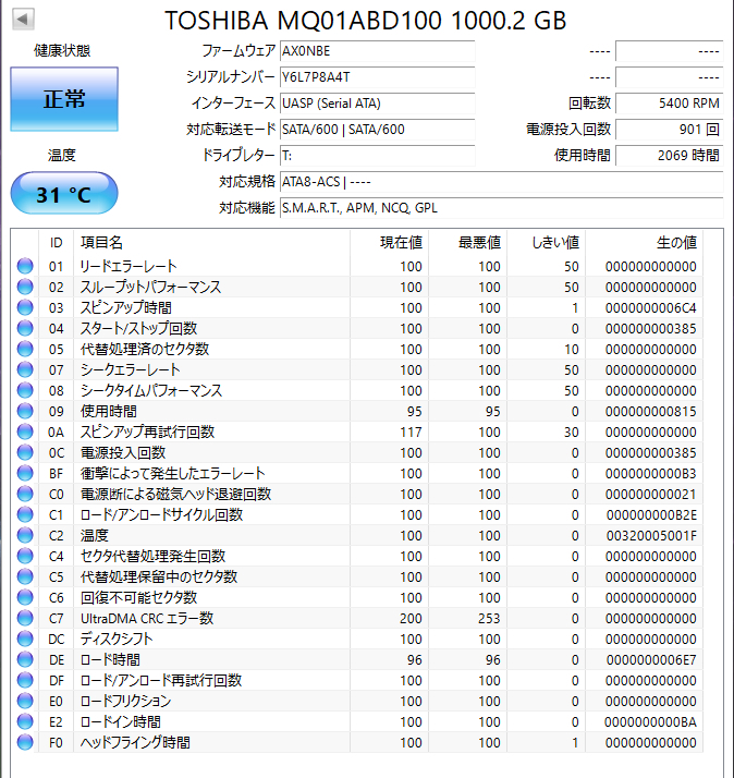 HDD健康状態:正常(CrystalDiskInfo)