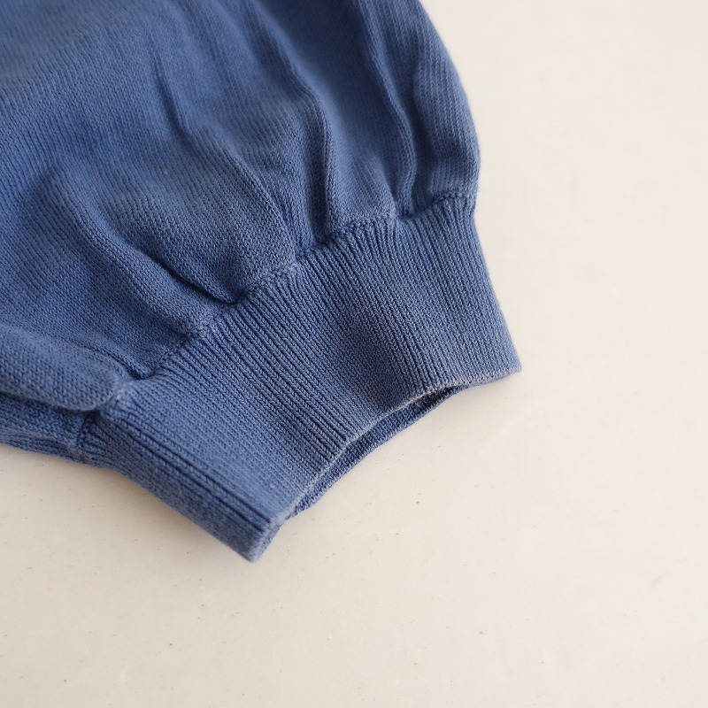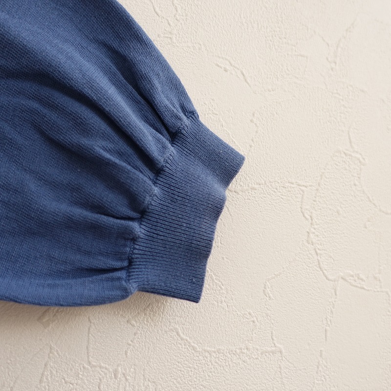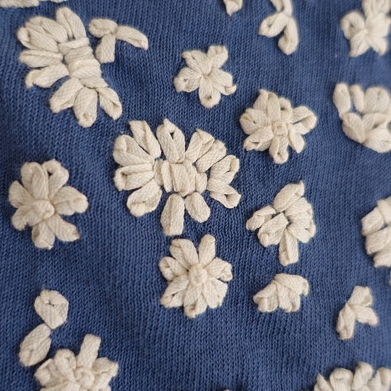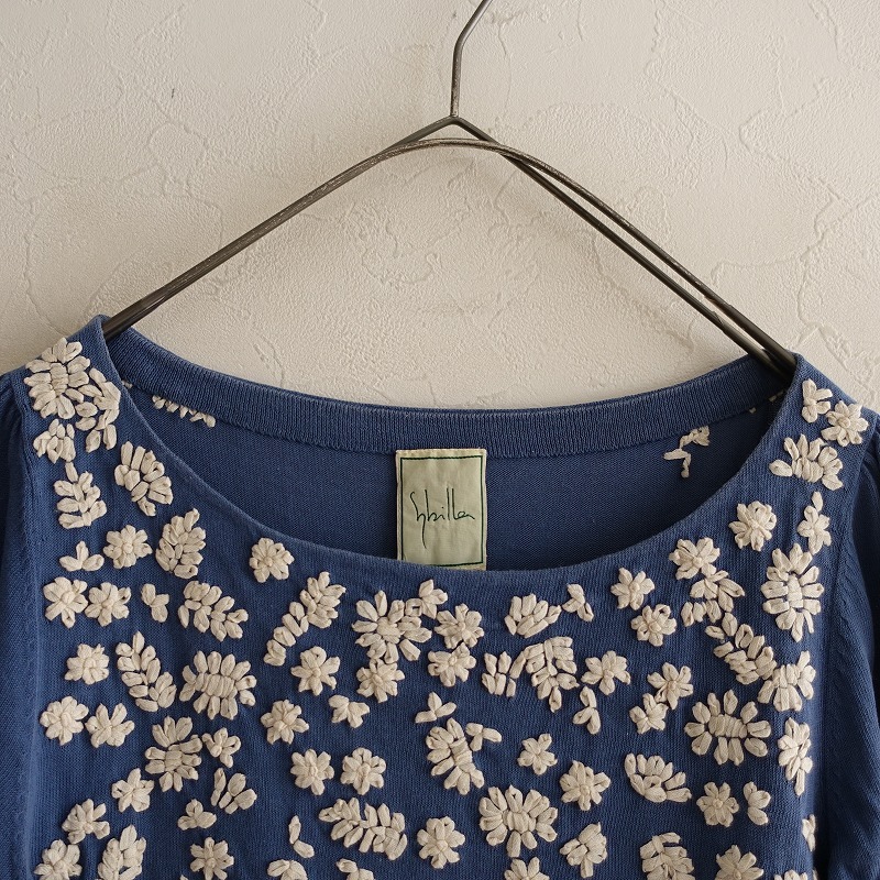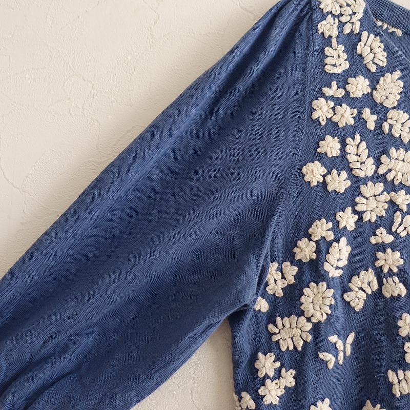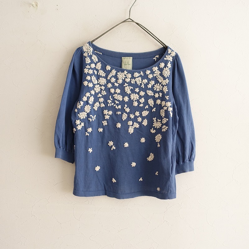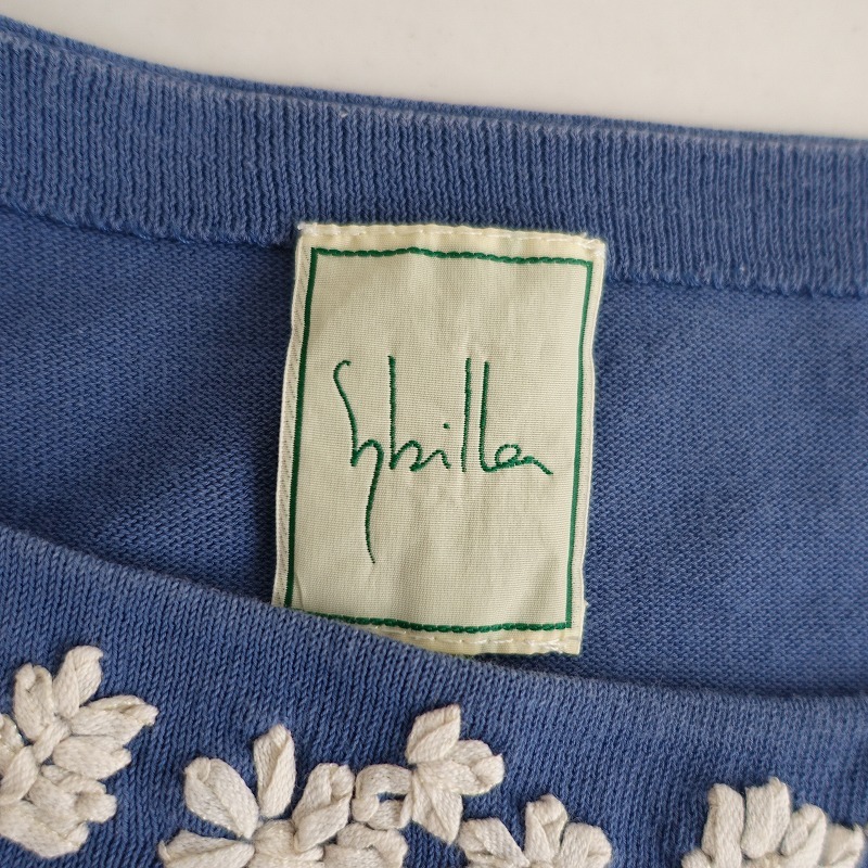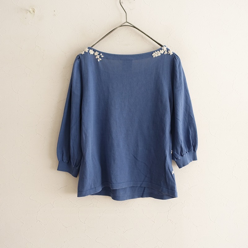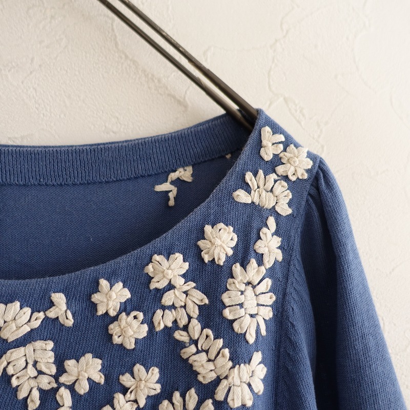Sybillaのフラワー刺しゅうニットカットソーです。カラーはくすみブルーで、薄手の綿ニット地です。前身頃&後ろ肩にオフホワイトのお花の刺しゅうが施されており、袖付け肩にギャザー入りで、袖口はリブ編みです。 |