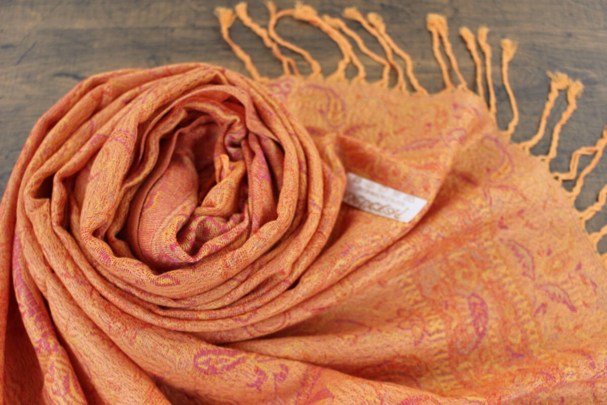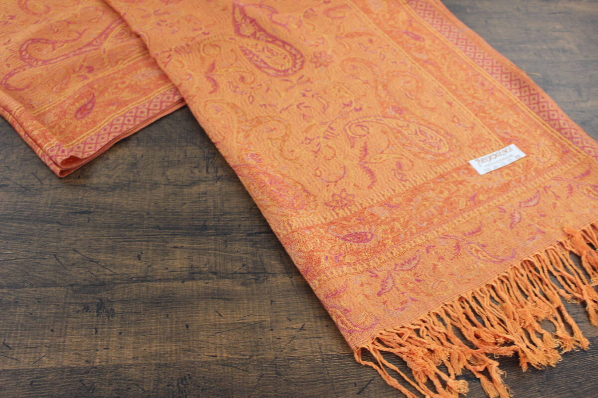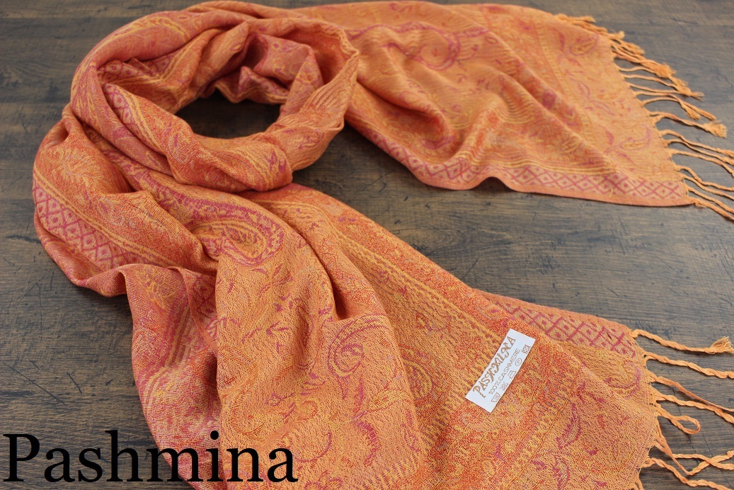 新品【パシュミナ Pashmina】ペイズリー柄 オレンジ ORANGE 大判 ストール カシミア100% Cashmere