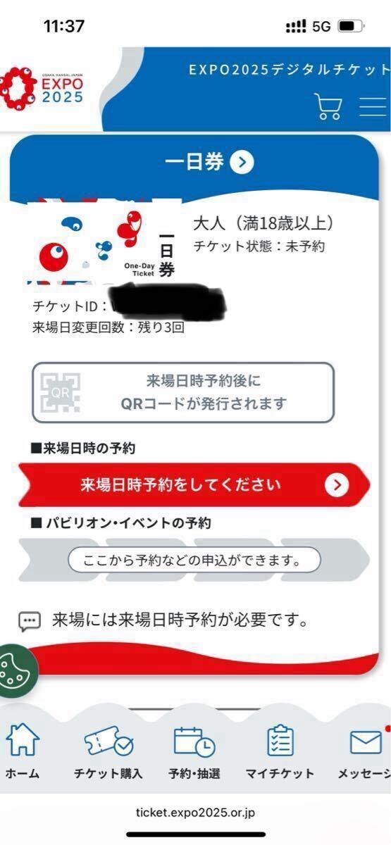 チケット受け取りには、万博IDの登録が必要ですので、事前に万博IDを取得して下さい。