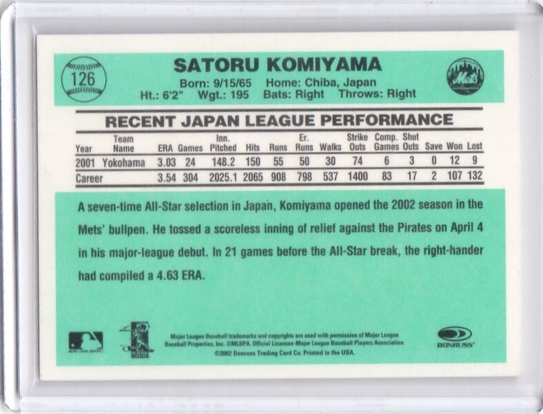★商品説明★ | 2002DONRUSS ORIGINALS 1984 DESIGN #126 RATED ROOKIE 小宮山 悟 MLBルーキー・カード ----------------------------------------------------------- ■小宮山 悟 MLB成績 2002年 1年 メッツ 25試合 0勝3敗 43 1/3回 33奪三振 防御率5.61 小宮山ファンの方、是非どうぞ! |