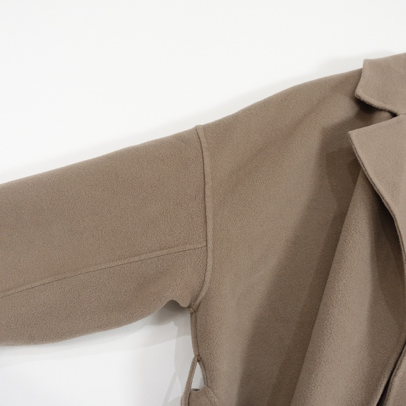 | Ray BEAMSのLA TORRE ベルテッドラップコートです。カラーはブラウンで、LA TORRE社の上質なイタリア糸を使用したふくらみのある生地で仕立てられています。フロントはボタンレスで、共布のベルトひもが附属しております。両サイドにポケット、裏地付き、定価(メーカー希望小売価格) 28,600円の商品です。 |