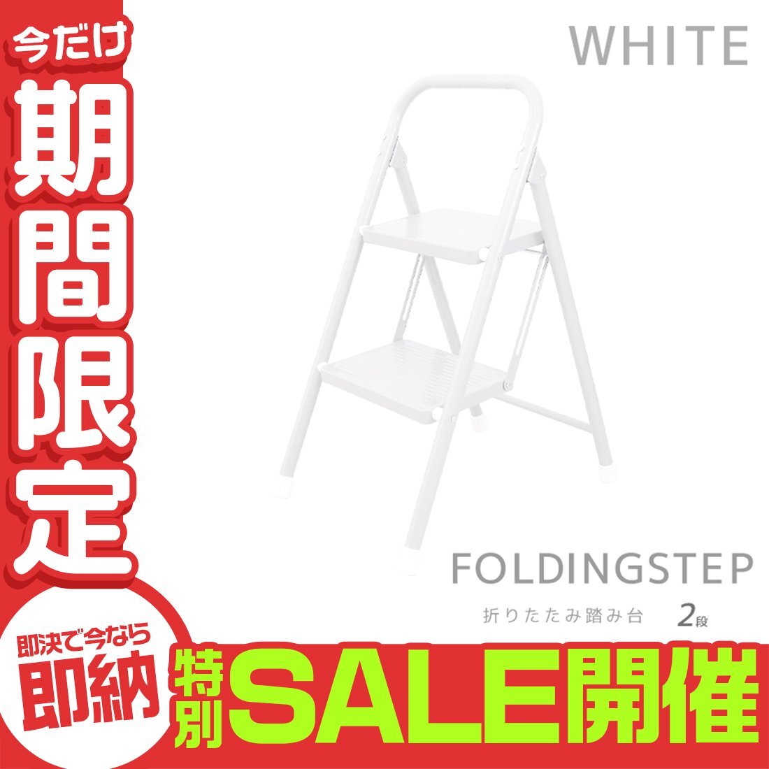 ステップ台 2段脚立 (折りたたみステップ 滑り止め加工) 耐荷重(約): 150kg 段数: 2段タイプ カラー: ホワイト 暮らしに馴染むやさしいカラーの折りたたみステップです。 一家に一台あると便利! 照明器具の交換や、高い位置になる棚から物を取り出すときに便利!! 耐荷重(約)150kg&ワイドステップ!安定感抜群で安心♪ また、滑り止め加工・握りやすい持ち手・脚先グリップで最上段まで簡単に上れます! お部屋や玄関に置いても邪魔にならないスリムサイズ。 折りたためばコンパクトに!手軽に持ち運びできちゃいます☆ |