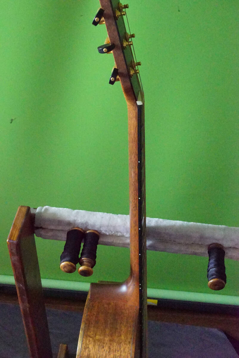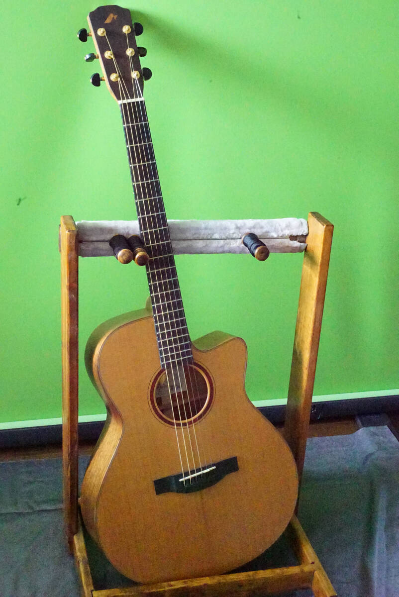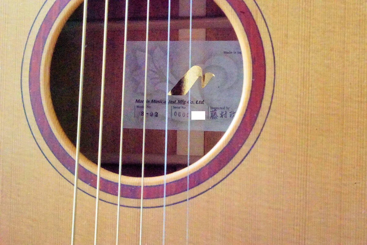 Morris (モーリス) S-92 【国産 アコースティックギター】。かつてネットで11万円ほどで購入したものです。本器は,音の分解能もよく,フィンガースタイルのギターとして素朴な木質の外観にマッチした鳴りです。確認しましたが,われ,ひび等はなく,外観まずまずといったところです(以上主観として)。