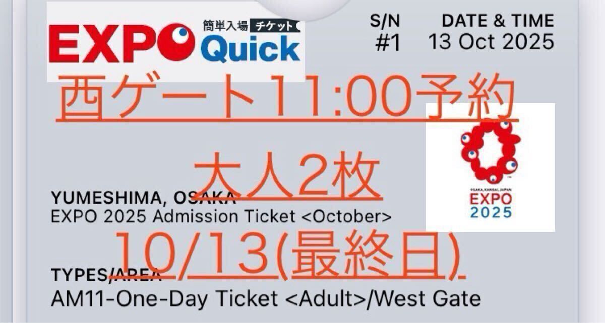 10/13(月) 11時予約 西ゲートの簡単クイックチケットです。