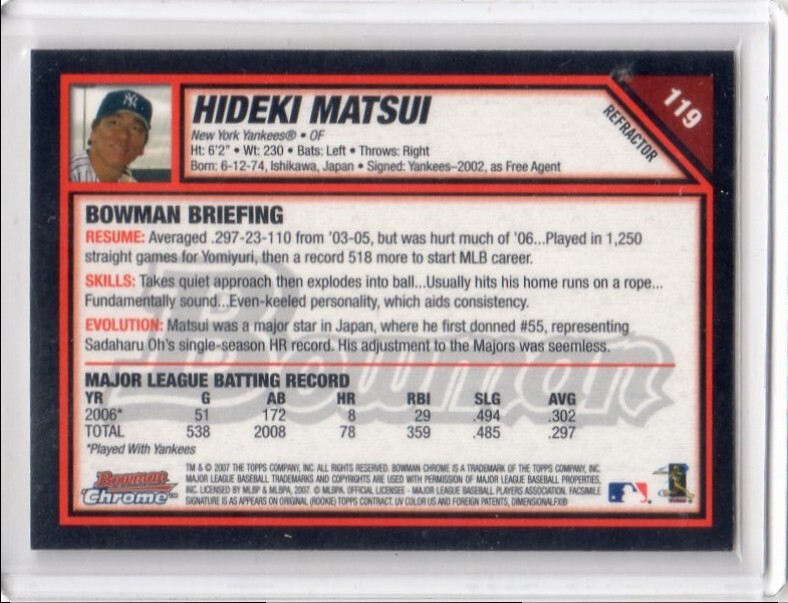★商品説明★ | 2007BOWMAN CHROME REFRACTOR #119 *サインは印刷 松井秀喜ファンの方、是非どうぞ! |