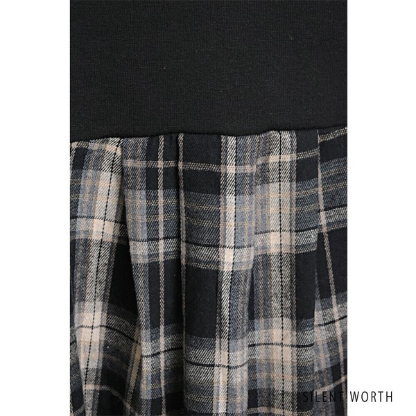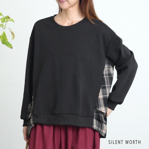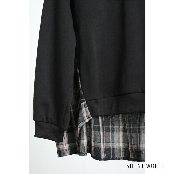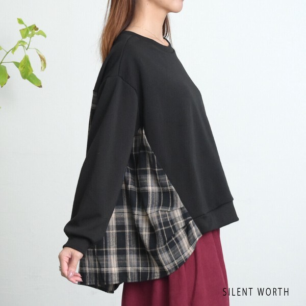 新品☆チュニック M(ゆったりめ) 裏起毛×チェック柄 配色切替 プルオーバー レディース オシャレ 秋冬/ブラック系/C-3184