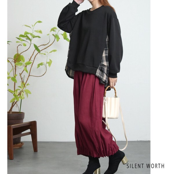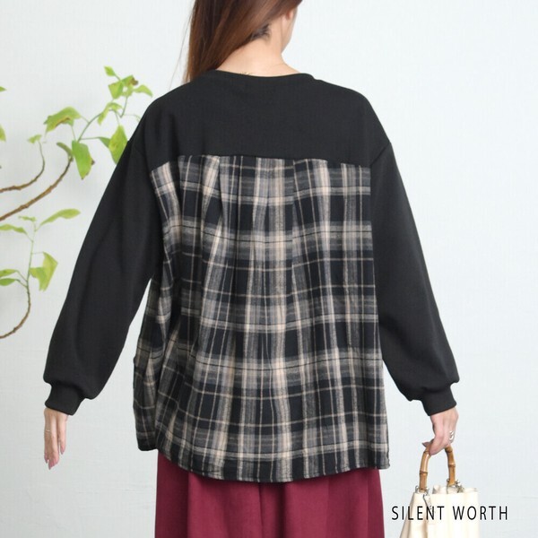・前から見るとシンプルなプルオーバーながら、後ろ身頃にふんわり広がるチェック柄切替が印象的