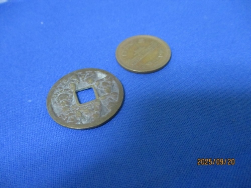 形状は中央に穴がある「穴銭」タイプが多いですが、さまざまなデザインやサイズがあります。