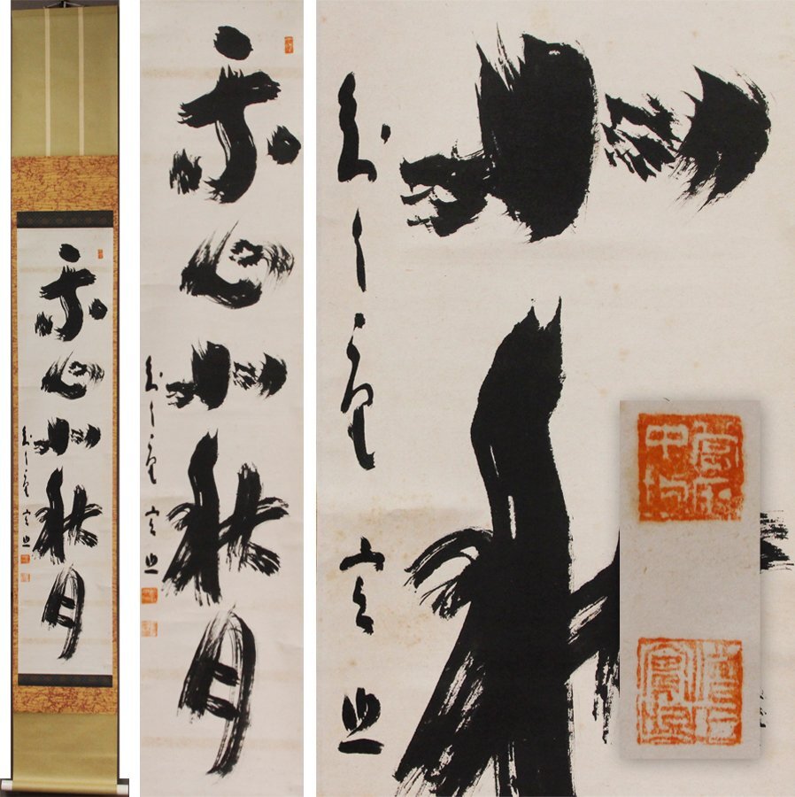 ■商品説明 定昭の手により、 独特の筆使いにて、「我(吾)心似秋月」が書かれた一行書の作品です。 【 我(吾)心似秋月(わがこころしゅうげつににたり) 】 唐時代の「寒山詩」の一節。 自分自身に向き合い、心の奥底に見入るとき、 その凛として澄み切った清らかさは、まるで秋の月のようだ。 ■紙本・肉筆 ■状 態 時代なりのヤケ・オレ・薄シミ等あり。 ■寸 法 軸寸法/約183.0cm×約24.5cm。 本紙寸法/約103.5cm×約22.0cm。 ■落 款 御覧の様な銘・落款等あり。 ■箱 箱。 【即決・送料無料】の表示商品に限り、 一部地域(北海道・沖縄)を除き、送料無料キャンペーンを実施しております。 ご希望の方は、お早めに入札して頂けます様、宜しくお願い致します。 【※※なお、作品に対して疑問や質問がある場合には、※※】 質問欄もしくは、ストア情報に当方の情報が記載されておりますので、こちらをクリックしてお問い合わせ下さい。 宜しくお願い致します。 |