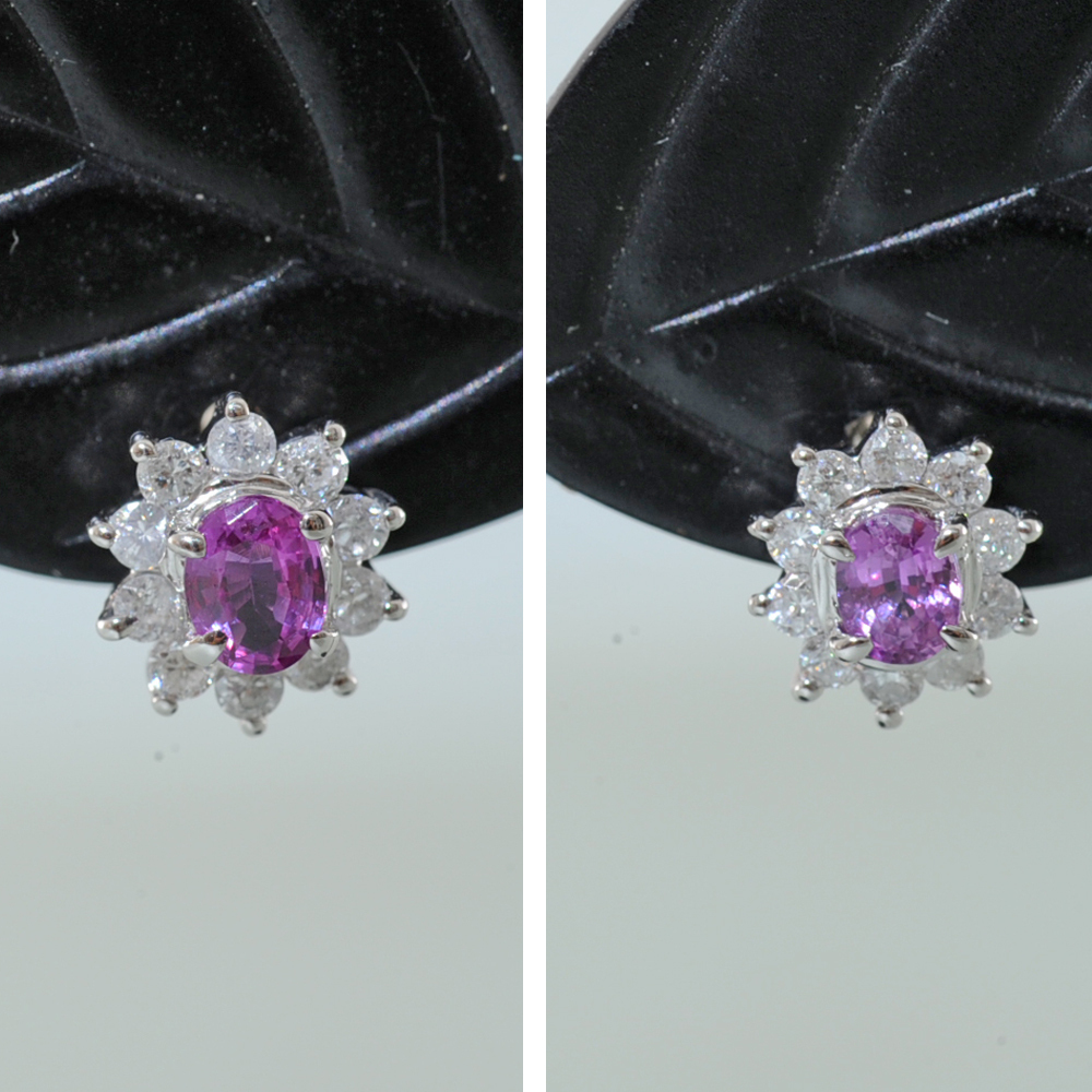 サファイアは加熱が行われています。 片方のピアスのサファイアの鑑別結果です。