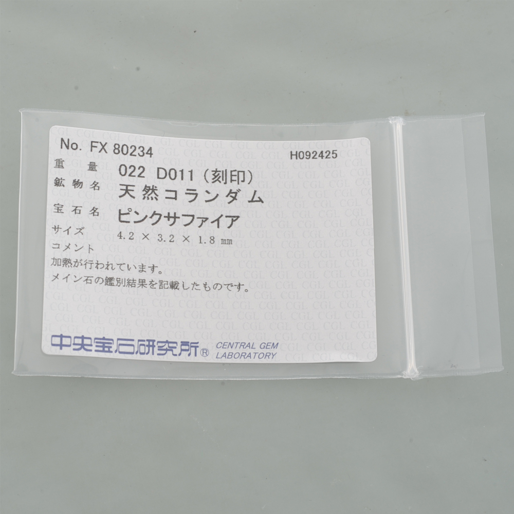 ● 付属品:ソーティングラベル(中央宝石研究所、天然コランダム、ピンクサファイア)のみ