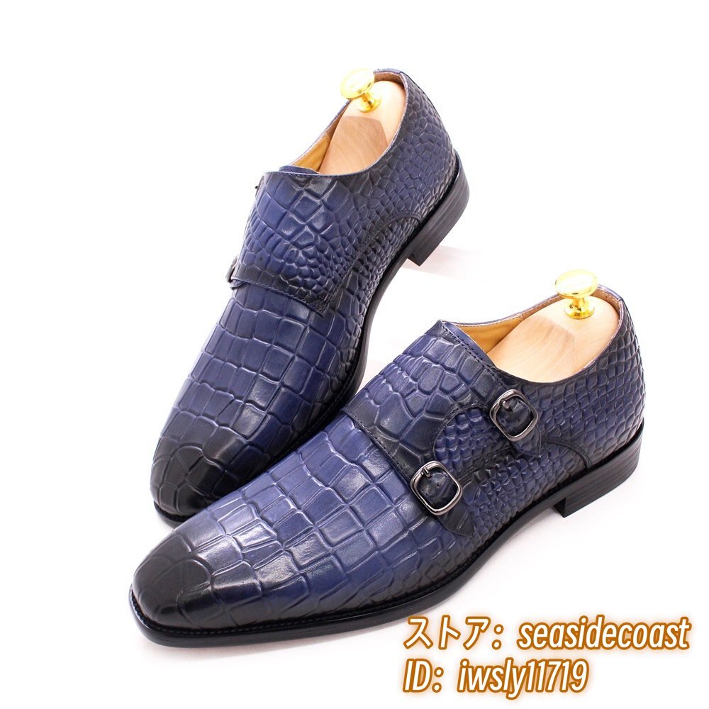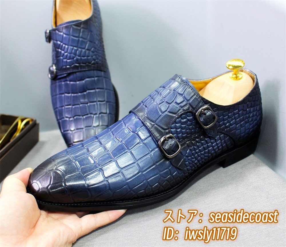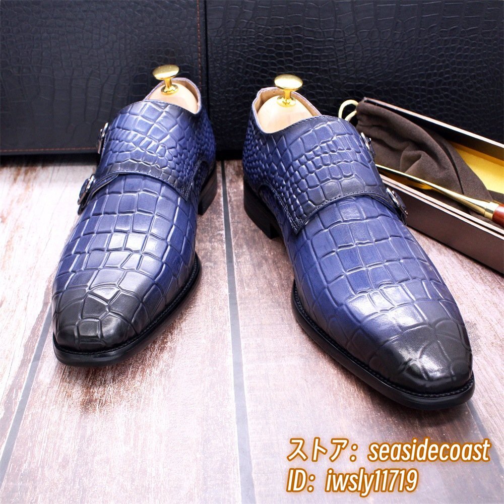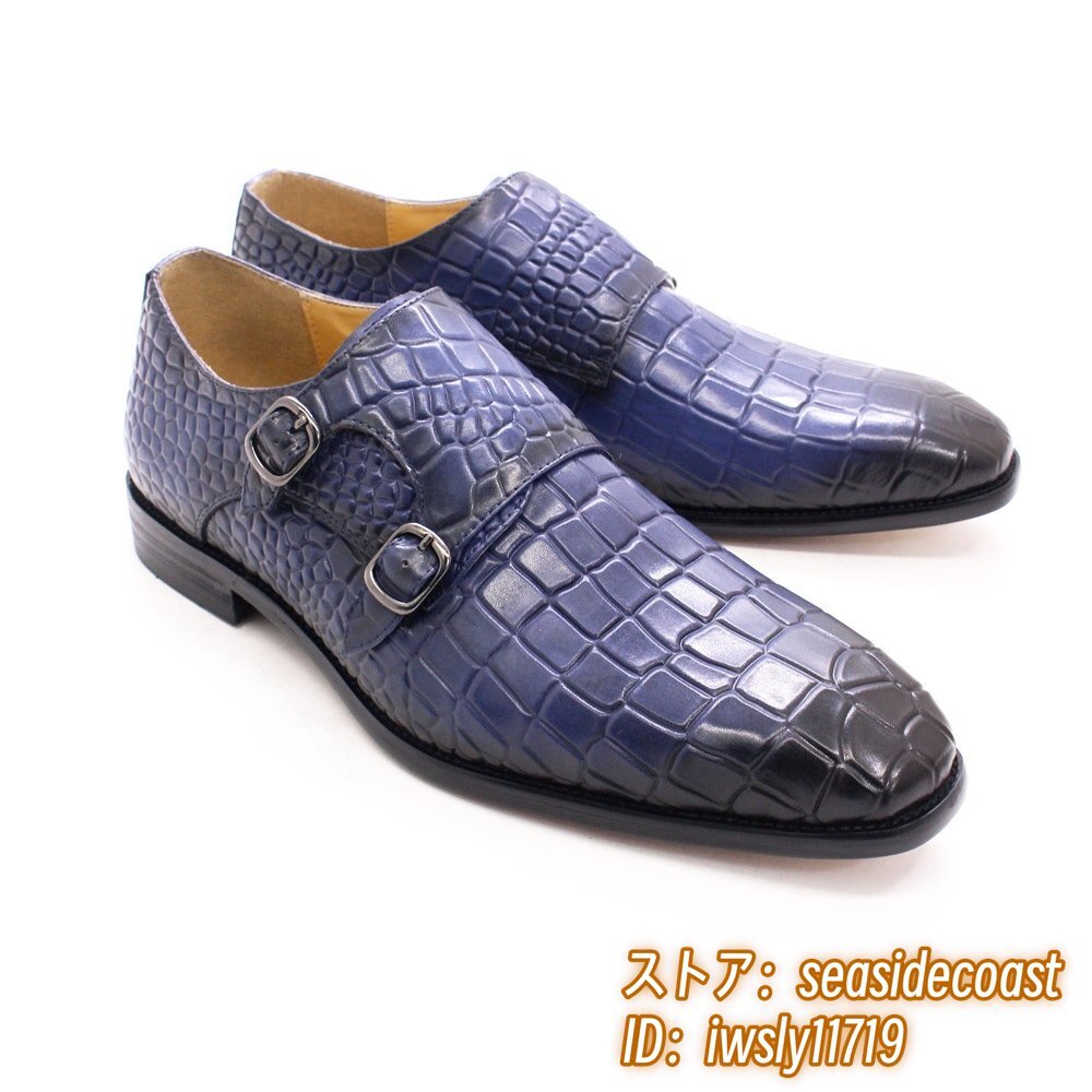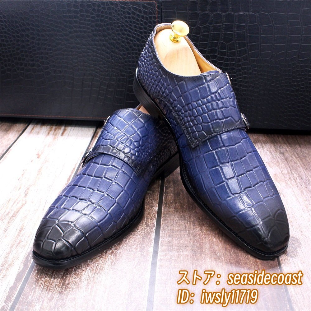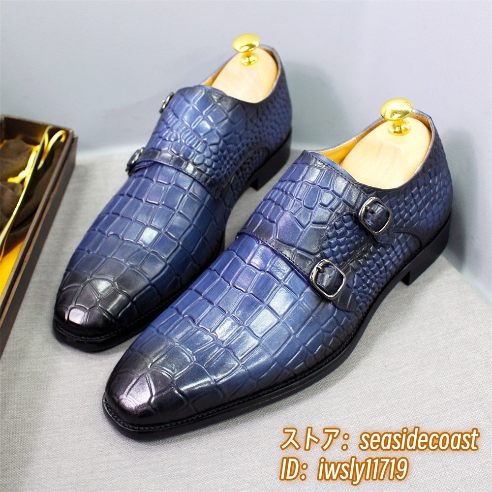超希少◆ダブルモンクストラップ 鰐柄 職人手塗り上げ 本革 ビジネスシューズ メンズ レザーシューズ 高級牛革 紳士靴 革靴 ブルー 25.5cm