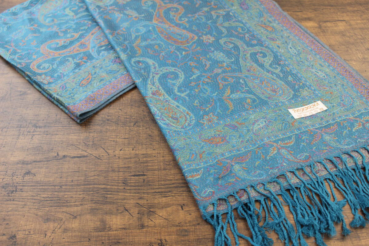 新品【パシュミナ Pashmina】ペイズリー柄 エメラルドグリーン系マルチカラー 緑 E.GREEN 大判 ストール カシミア100% Cashmere