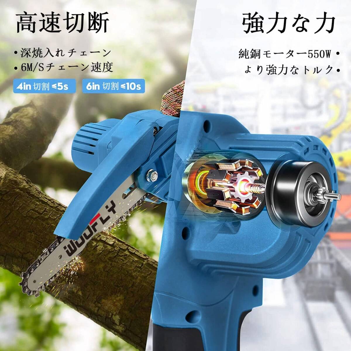 • 2022年に特許を取得した最新の純銅モーター】特殊純銅製モーターは、馬力が30%アップし、消費電力が20%削減。独自の放熱設計、24時間連続して動作しても燃焼しません。 高電圧の21V 6000mAhリチウムイオンバッテリーと組み合わせることで、パワーは550Wに達し、直径15cmまでの枝を10秒で切ることができ、1つのバッテリーで120分間の連続運転が可能です。それは庭を剪定し、枝を切り、DIY家具のためのあなたの最高のヘルパーです。