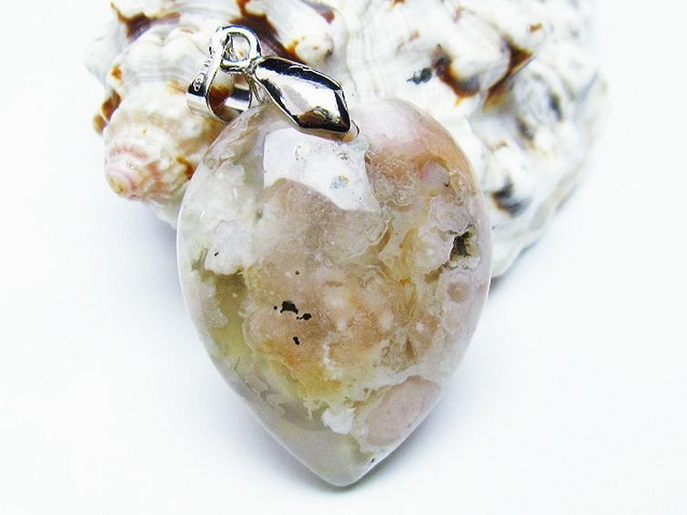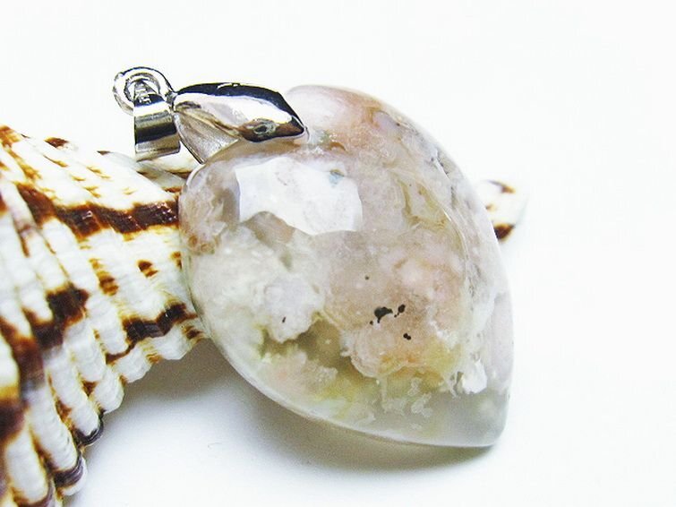 ■商品名: 桜メノウ チェリーブロッサムアゲート ハート ペンダント ■商品ID: T335-2750 ■商品重量:約 8.4g ■商品サイズ: 高約:28mm 横約:23mm 厚約:9mm 【アゲート(瑪瑙)】 和名では瑪瑙(めのう)といい、アゲートの模様が馬の脳のように見える事からこのような名前が付けられました。 アゲートは赤、緑、青、黄、黒など、様々な色に着色されることで石本来のパワーがさらにアップするといわれており、着色により魅力を増す天然石はアゲートだけとも言えます。 さらにはアゲートを組み合わせるとペアになっているペアアゲート(トレジャーメノウ)は龍穴を生み出すとされ、風水的にも良いといわれています。 アゲートは古来より日本やインドやチベットなどで魔よけやお守りとされてきました。 失敗や不幸を遠ざけ金運や仕事運、成功運とも結び付けてくれる効果のほか、安産のお守りにも良いとされています。 さらに家庭円満や対人関係をスムーズにするなど、オールマイティな効果を持った石です。 ⇒ アゲートをもっと詳しく ◆ワンポイント情報 アゲートはカルセドニーの変種で、染色がされていなくともそれぞれの種類に多様な色があります。 ざっと仲間を挙げてみてもオニキス(黒)、サードニクス(橙色)、ブルーアゲート(青)、グリーンアゲート(緑)、イエローアゲート(黄)、ブルーレースアゲート(縞青)、モスアゲート(縞緑)、天眼石(縞黒)、カーネリアン(橙色)、ジャスパー(多様な縞)などとても多くの特徴と色合いを持っています。 |