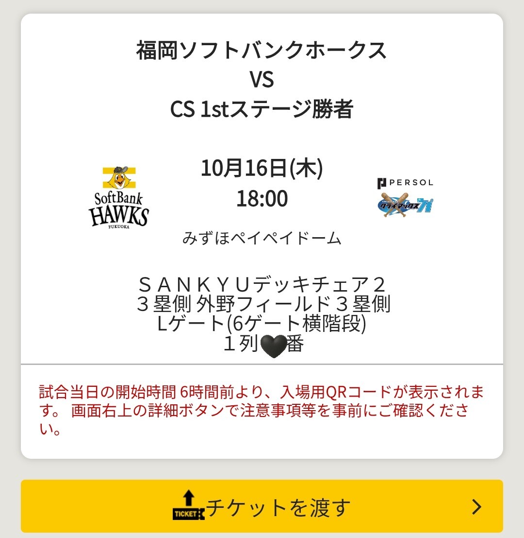 10月16日(木)デッキチェア レフトホームランテラス 福岡ソフトバンクホークス対日本ハムファイターズorオリックスバファローズ チケット 1枚
