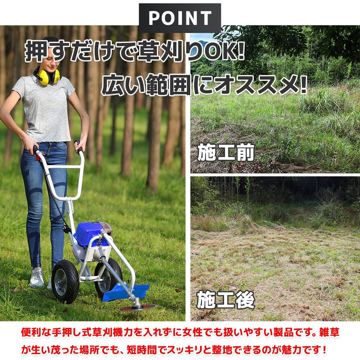タイヤ付き草刈り機なので、押だけで楽々前進!手持ち式より疲れにくい草刈り機です!