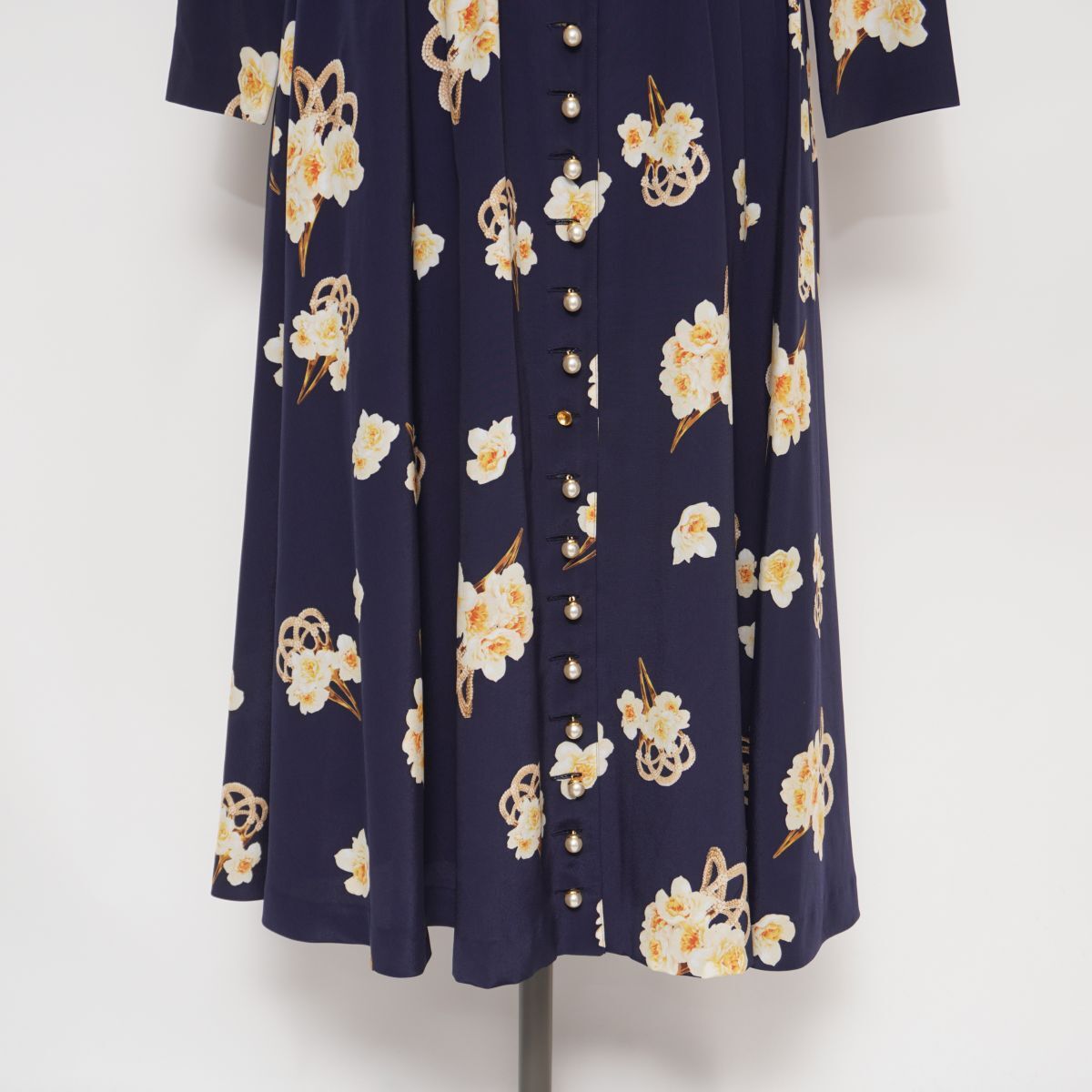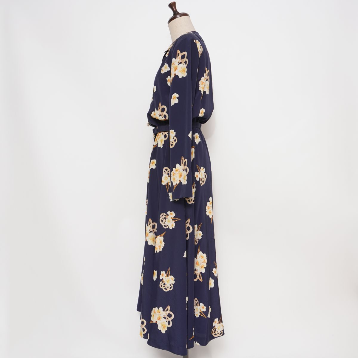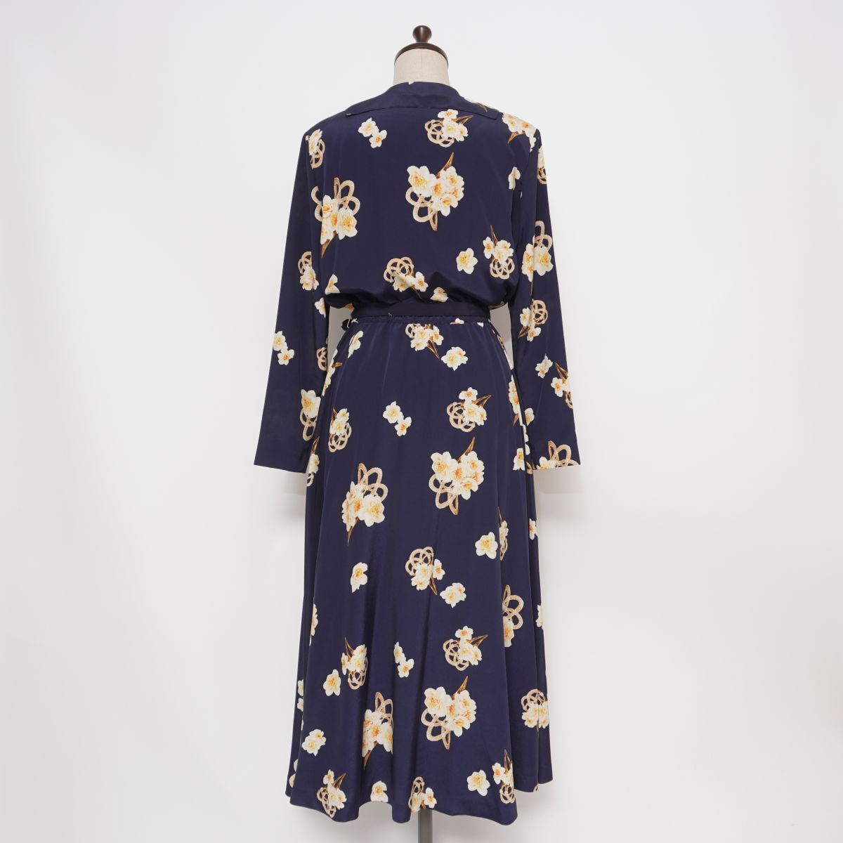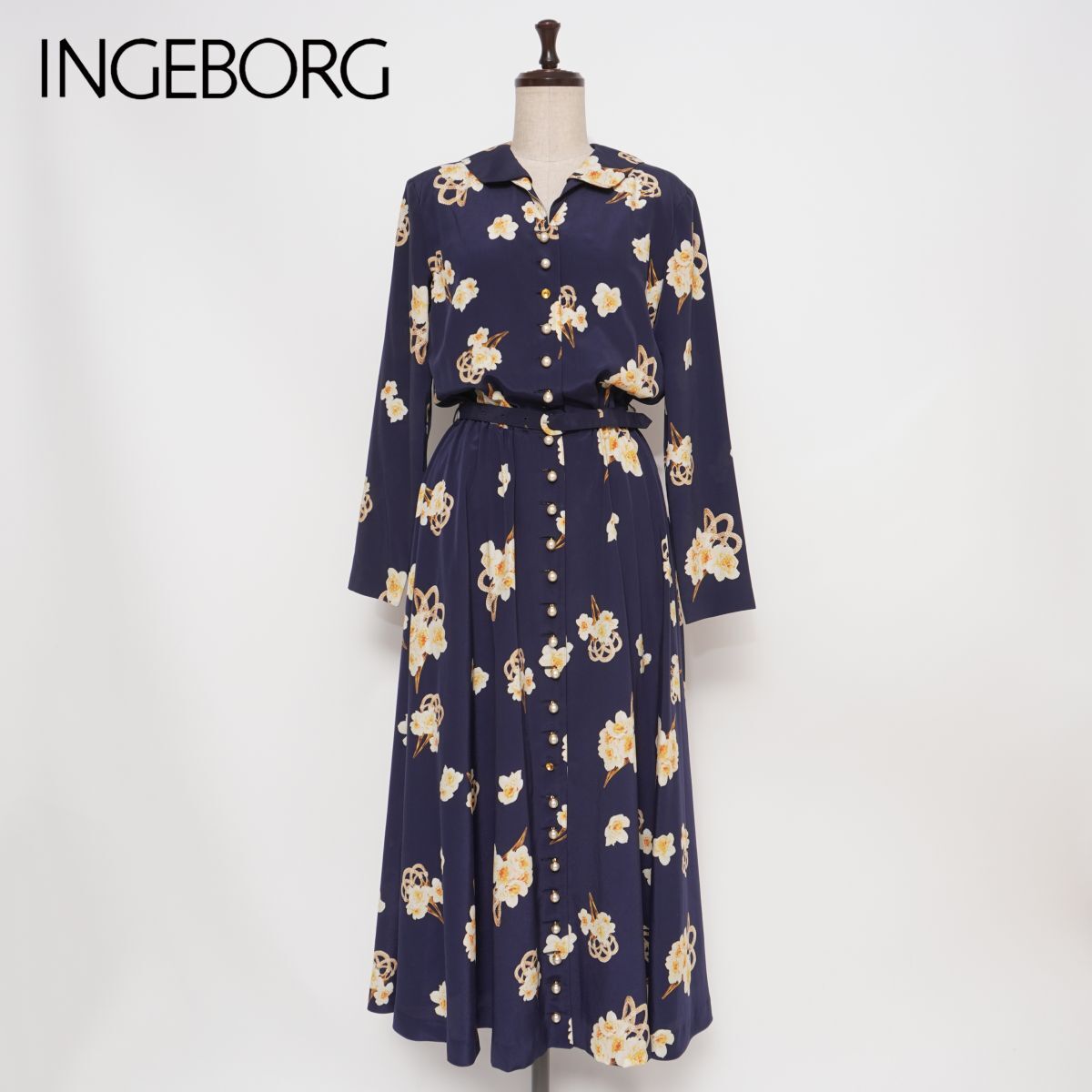 INGEBORG インゲボルグ クチナシ カンザシ柄ロングシャツワンピース 総柄 パール 開襟 ウエストベルト 長袖 ネイビー 紺 サイズM相当*GD222