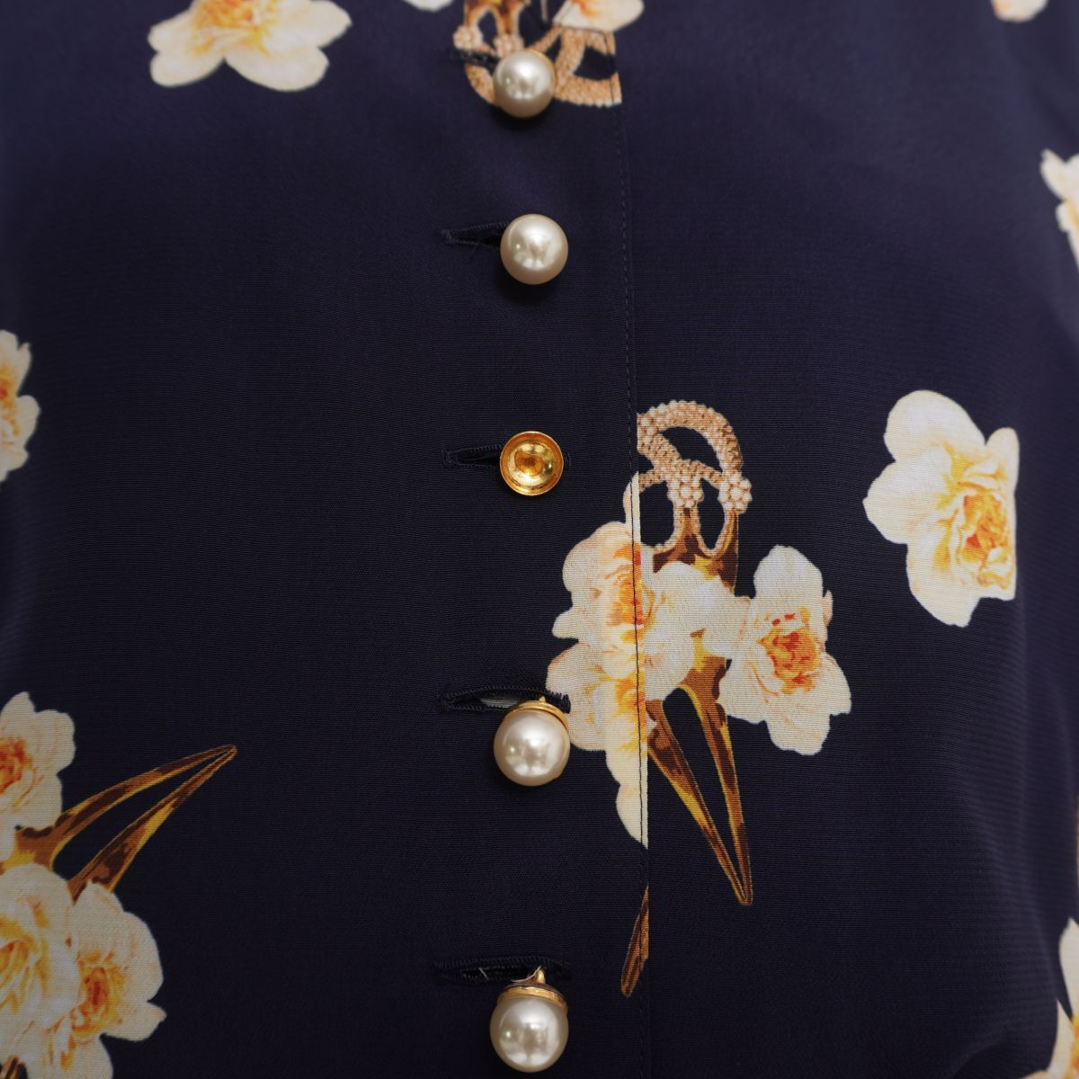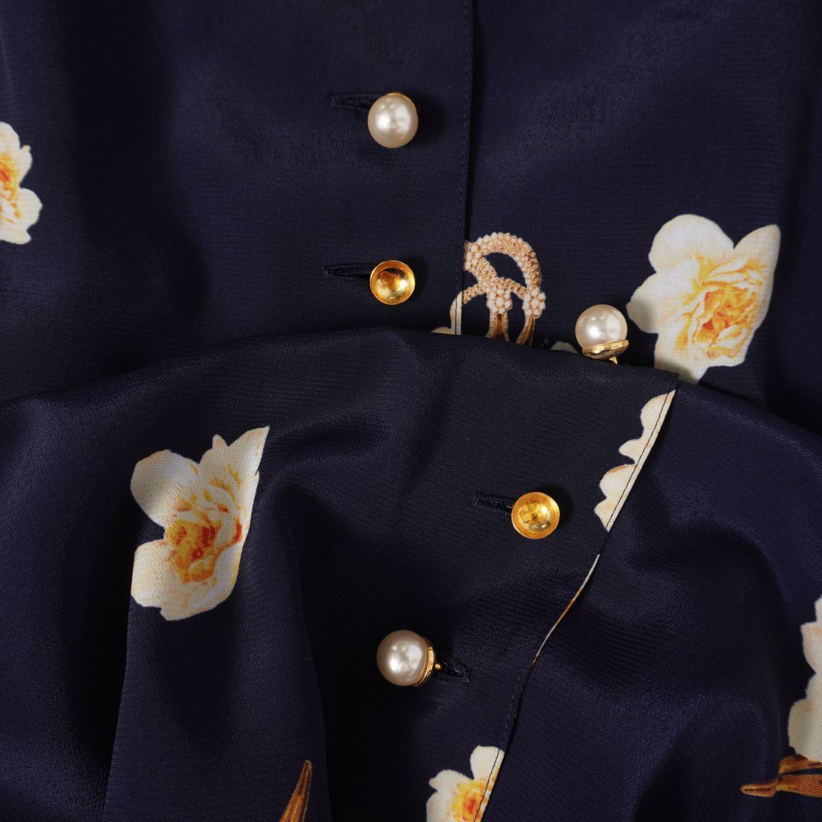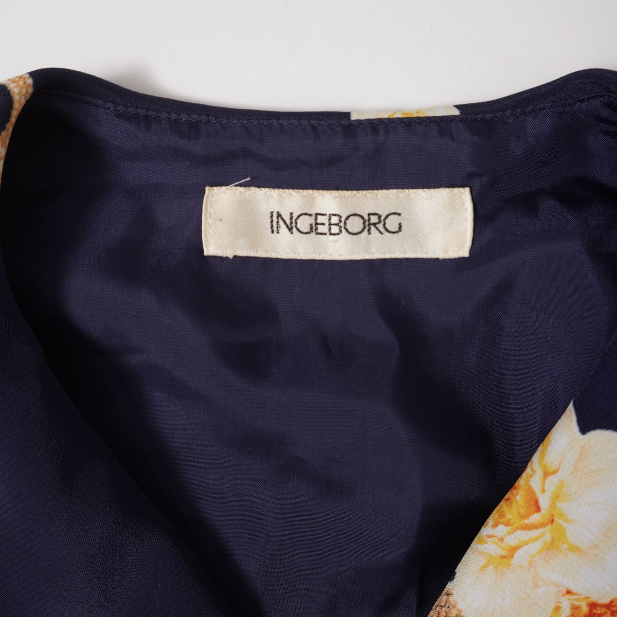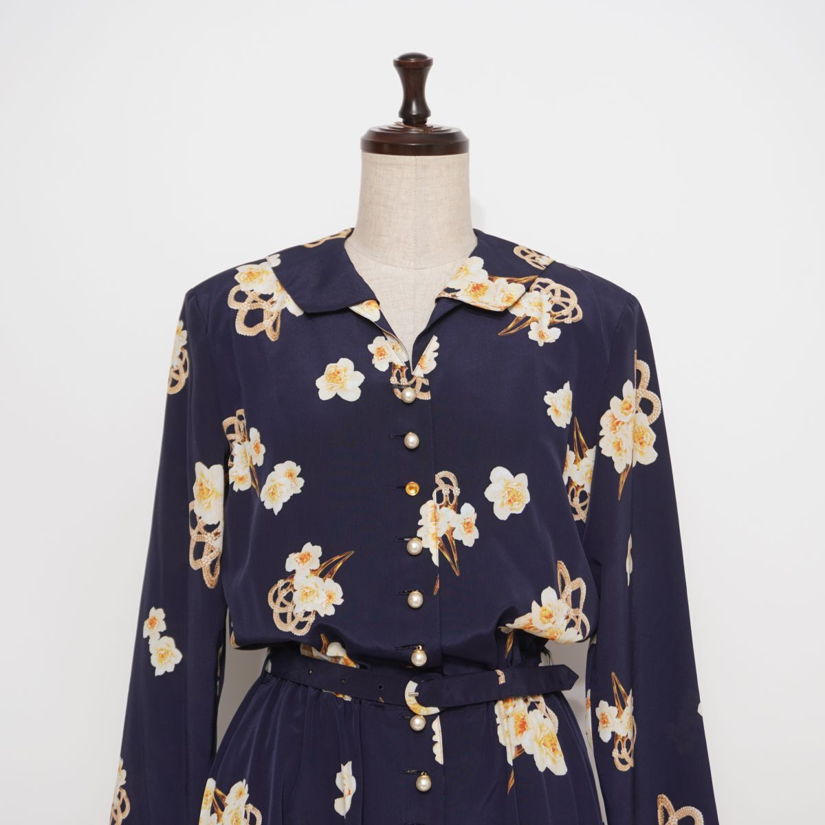 INGEBORG インゲボルグ クチナシ カンザシ柄ロングシャツワンピース 総柄 パール 開襟 ウエストベルト 長袖 ネイビー 紺 サイズM相当*GD222