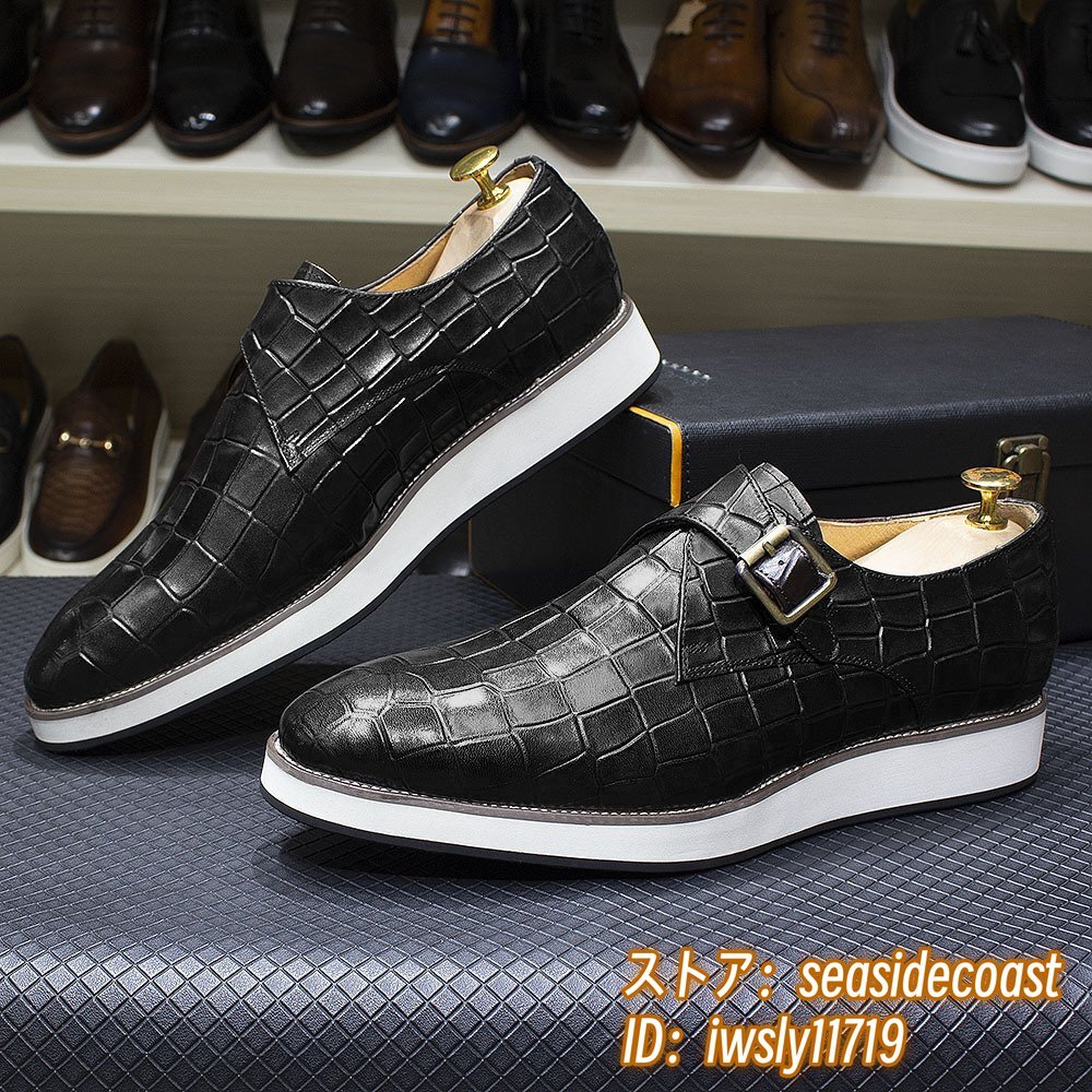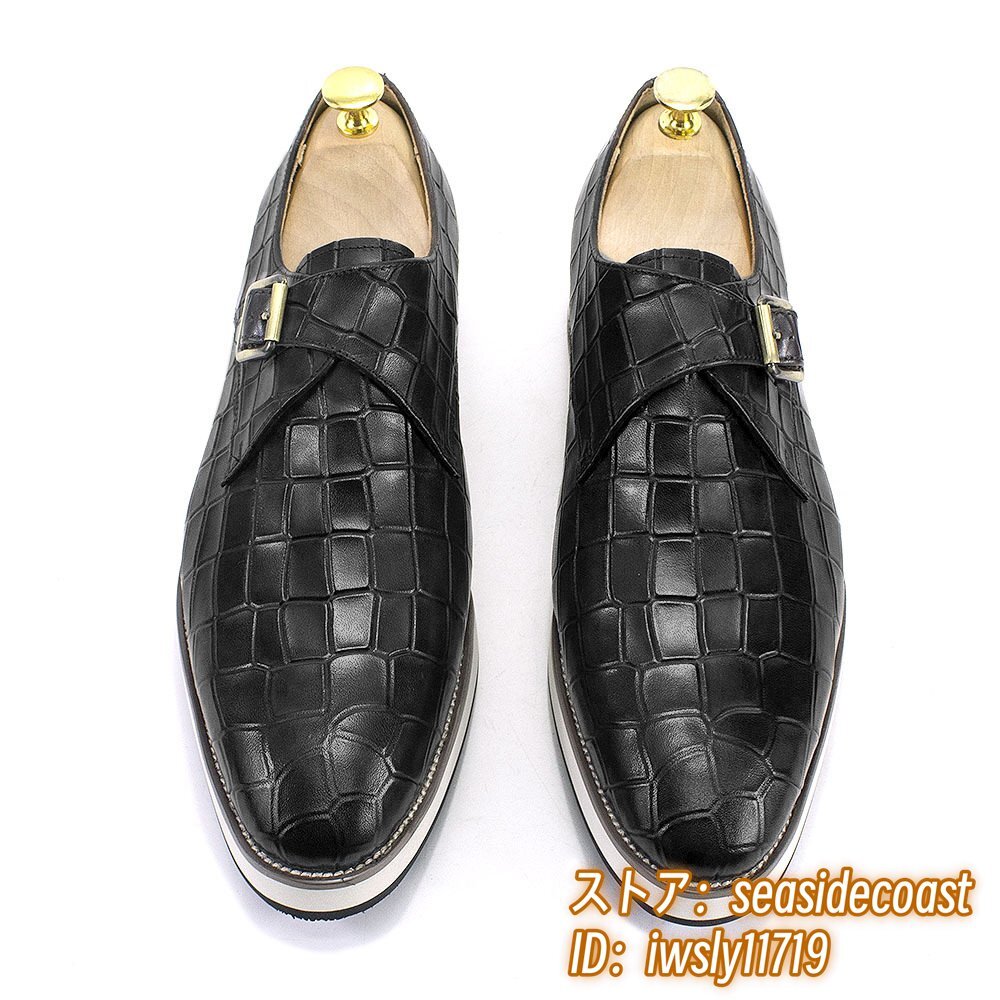 定価11万超◆鰐柄 ビジネスシューズ メンズ 超希少 職人手作り 本革 レザーシューズ 厚底 スリッポン ローファー 高級牛革 ブラック 27.0cm