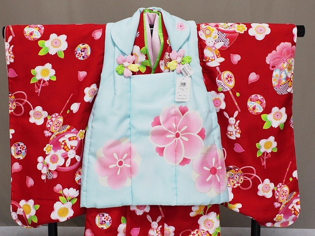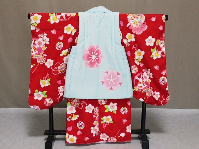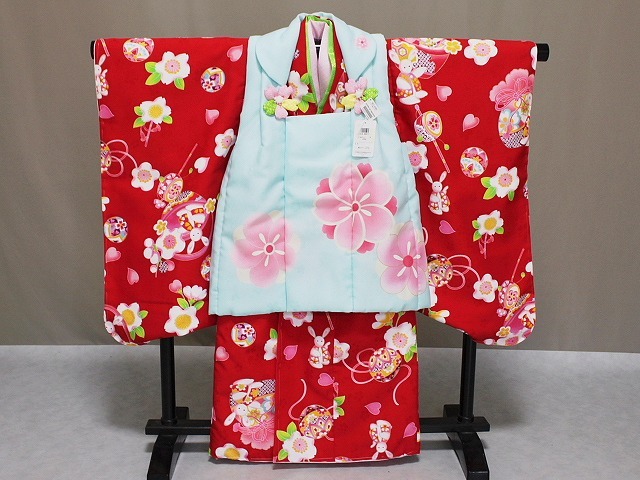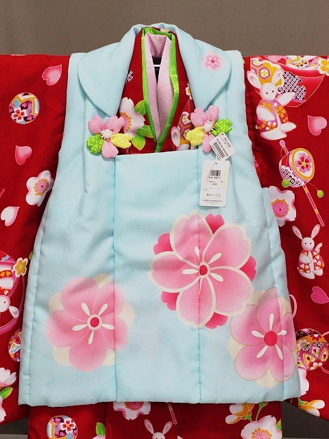 A1449-01 塚句野世 高級ポリエステル地の三歳用被布セットです。 手触りも絹と間違えてしまうほどの質感となっています。 こちらのかわいい被布セットをお子様用の一枚として 家族の記念の着物としてお持ちになってはいかがでしょうか。 足袋は付いておりませんが お子様のサイズに合わせてお求め下さい。当ショップにもございます。へこ帯なども多数ございますので ぜひお寄りくださいね。 柄などは、着物は花柄地紋の見える赤色地に ピンク色などにて花柄やうさぎの柄などがあります。 長襦袢はピンク色です。重衿は若草色です。 被布は、花柄地紋の見える淡い水色地に ピンク色にて花柄があり金色の縁取り加工があります。 巾着・草履は赤色です。◎ | ||||||||||