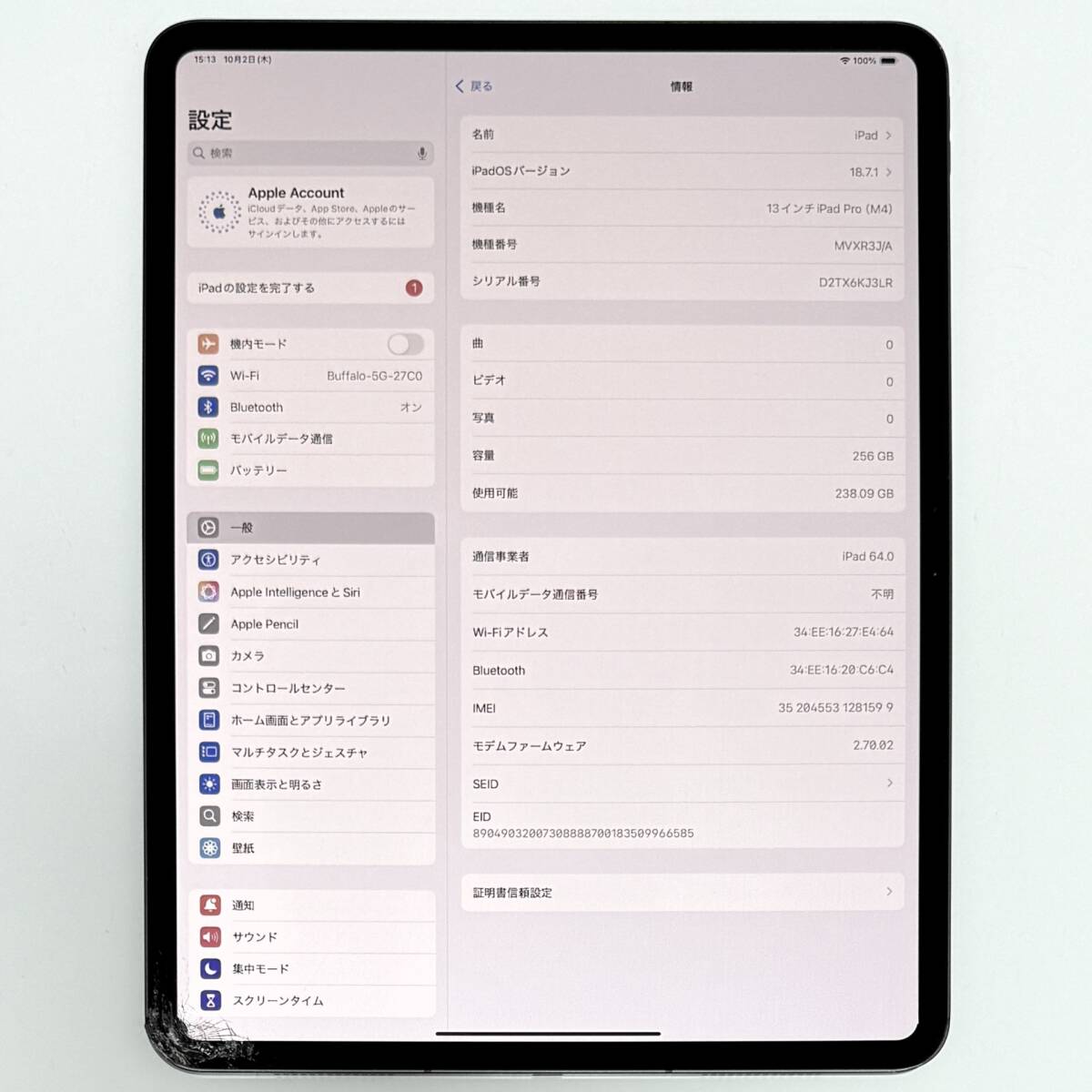 商品説明 | インボイス(領収書)の発行が可能でございます。 事業者登録番号 T8810656303714 ご要望の場合は商品の落札後に取引メッセージよりお申しつけくださいませ。 ●商品の状態 ※iPad Pro (13インチ) (M4) スペースブラック 256GB (2024年春モデル) MVXR3J/A Wi-Fi+Cellular ※モデル:A2926 ※キャリア:Appleストア ※iOSバージョン:18.7.1 ※シリアル番号:D2TX6KJ3LR ※IMEI製造番号:352045531281599 ※バッテリーの状態:最大容量97% (充放電回数155回) ※アクティベーションロックは解除しております。 ※iCloudアカウントはサインアウトしていますのでご安心くださいませ。 ※データは初期化済みでございます。 タッチパネルはApple純正ですのでTure Toneの使用が可能でございます。 FaceIDを含む前後カメラ及びスイッチとボタン類タッチパネルの作動状態は良好です。 基本動作は全て問題ないことを確認しておりますが タッチパネルにヒビ割れがありますので 訳ありジャンク品として出品をさせていただきます。 記載事項以外の不具合などの発生及び不備などがございましても 完全ノークレーム返品不可でのお取引とさせていただきます。 商品状態ランク:D iPad本体は使用感がある状態です。 タッチパネルにヒビ割れがあります。(状態が写真に上手く写りませんでした。) フレームのカドに使用感がございます。 バックパネルの上下の淵に薄い擦れがあります。 iPad本体と箱以外の付属品は欠品しております。 状態ランク S:新品未使用品 A:ほとんど傷がなく良い状態 B:多少の使用感がありますが比較的きれいな状態 C:目立つ傷ダメージ汚れなどがある状態 D:非常に目立つ傷ダメージ汚れなどがある状態 ●出品している商品について 私以外の方が使用しておりました商品を出品させていただいておりますので 修理歴、修復歴、部品交換歴がある可能性があり 保証による交換品または店頭展示品(デモ機)である可能性もございます。 商品説明にはなるべく正確な状態をお伝えするべく点検をしておりますが 記載するべき事項を見落としている可能性がある場合がございます。 商品の状態の表現につきましては相違及び記載漏れなどがある場合がございます。 商品の状態の表現の相違につきましては一切の対応をいたしかねます。 ボタン類及びカメラその他タッチパネルなどは経年劣化がある事をご理解願います。 カメラの劣化による内部の塵の映り込みは判別が難しいため一切の保証をいたしかねます。 スピーカーとマイクの音の出入力の経年劣化につきましても保証をいたしかねます。 ご使用時のバッテリーのパフォーマンスにつきましては保証いたしかねます。 バッテリーの容量低下による不具合等は一切の対応をいたしかねます。 Apple公式以外のお店で修理や点検などをされた場合は一切の保証をいたしかねます。 ご自身で部品の交換または分解などをされた場合も一切の保証をいたしかねます。 タッチパネルにヒビ割れがありますので 訳ありジャンク品として出品をさせていただきます。 記載事項以外の不具合などの発生及び不備などがございましても 完全ノークレーム返品不可でのお取引とさせていただきます。 |