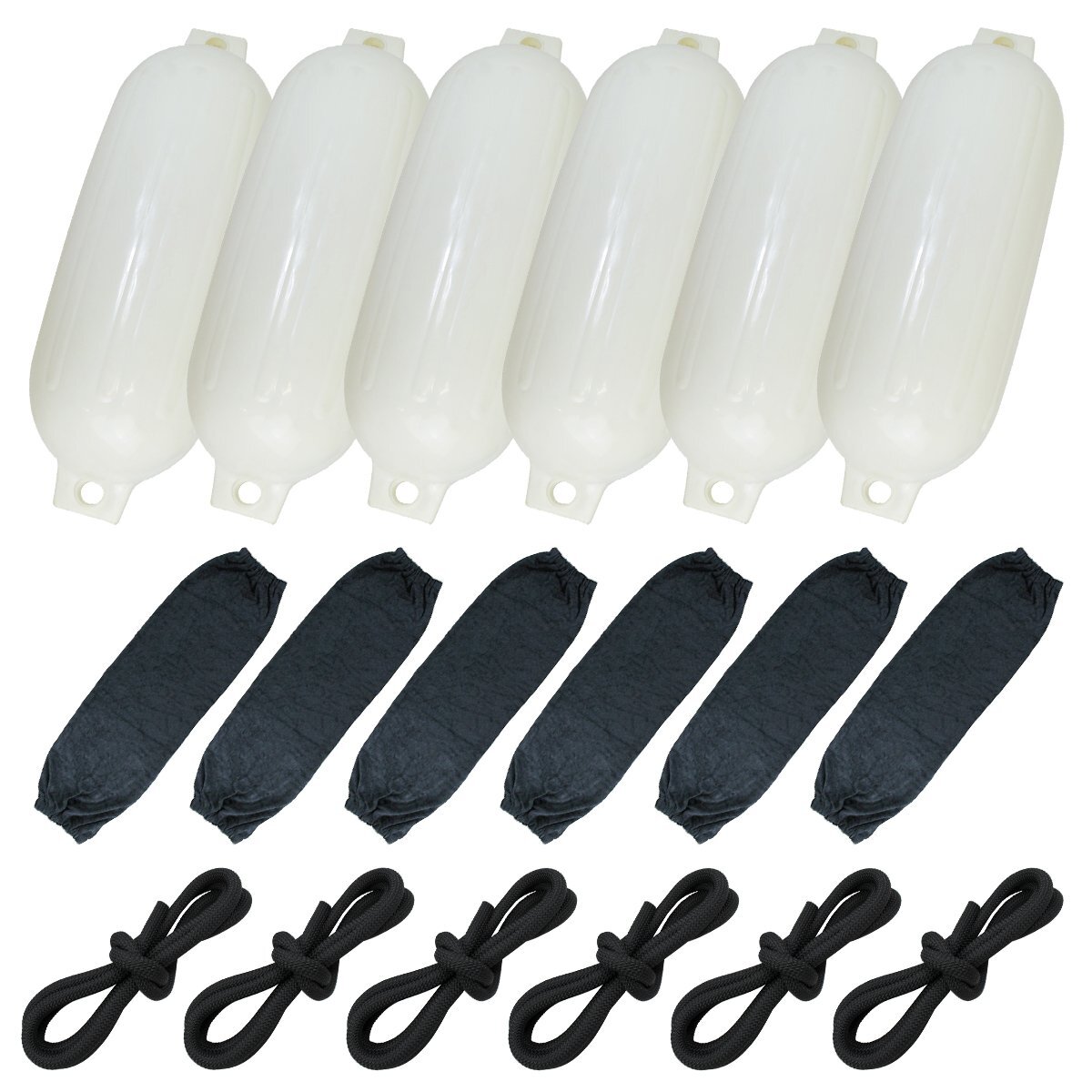 『3種×6セット』ボートフェンダー 680×240mm&黒カバー&ロープ 黒 2m 船 浮き ブイ フロート 係留ロープ